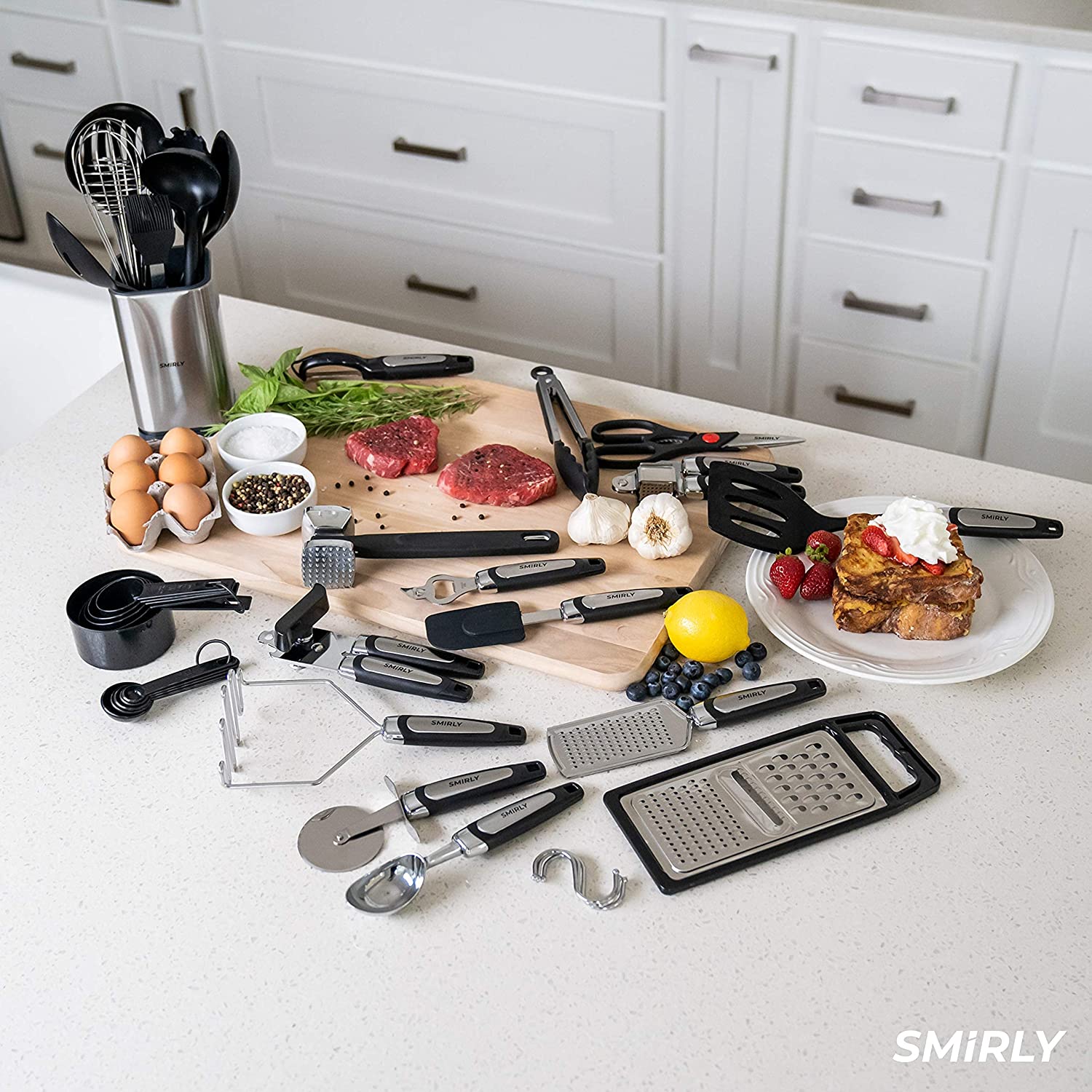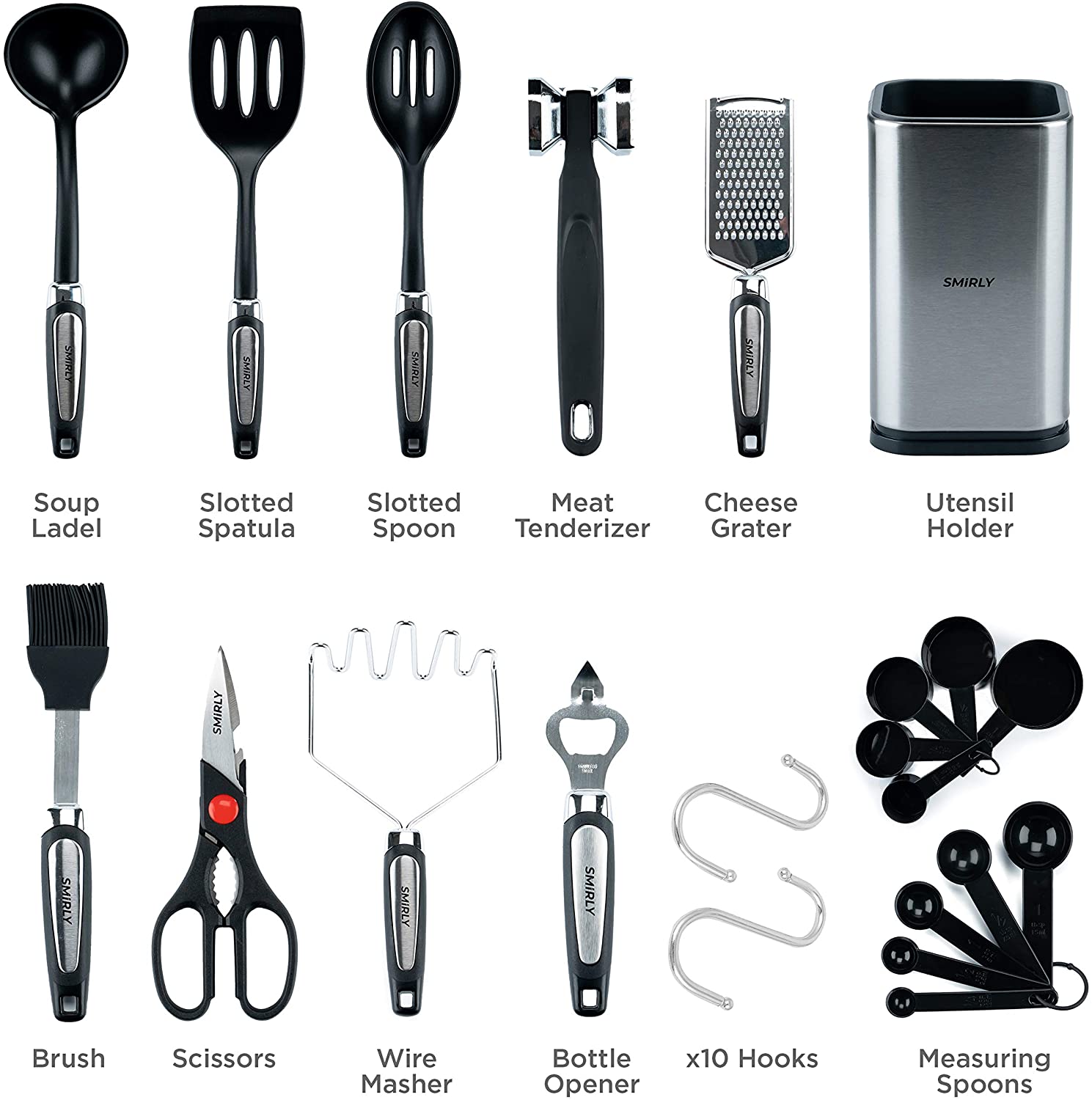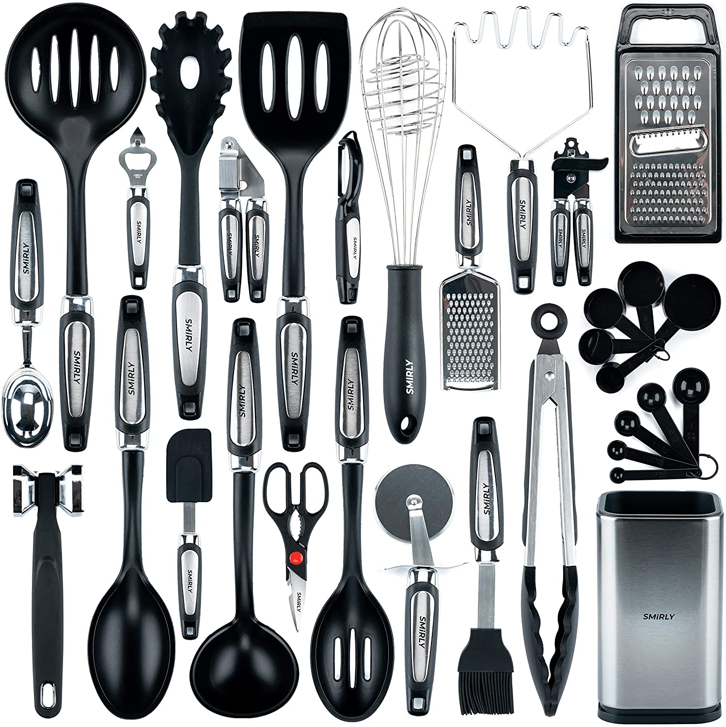 • ✅There's Nothing You Can't Do - Smirly's kitchen cooking utensils set includes many slotted spoons, spatulas, and ladles as well as a cheese grater, bottle opener, wire masher, measuring spoons & cups, scissors, ice cream scoop, pizza cutter, and more. Honestly, there are too many nonstick cooking utensils to list. If you are starting in your own home, or want to get rid of your worn-out cooking stuff, we offer a complete set of premium kitchen essentials for new homes.