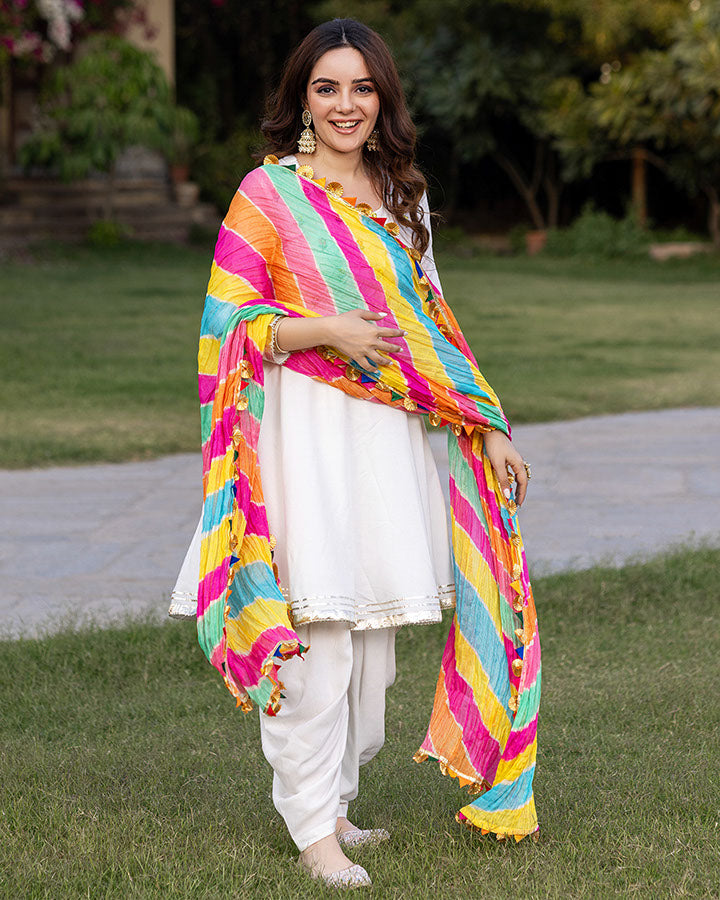 A white Patiala suit set with a multi-color leheriya dupatta is a beautiful and traditional outfit that offers comfort and style. The Patiala suit is a traditional Indian outfit that features a loose-fitting top and baggy pants that gather at the ankle, creating a relaxed and comfortable fit. The suit is embellished with delicate embroidery or other embellishments. The multi-color leheriya dupatta is the main highlight of this outfit. The dupatta is a long scarf that is usually draped over the head and shoulders, adding a touch of color and vibrancy to the outfit. The leheriya pattern is a traditional tie-dye technique that creates a beautiful and intricate design of diagonal stripes and patterns, usually in multiple colors.