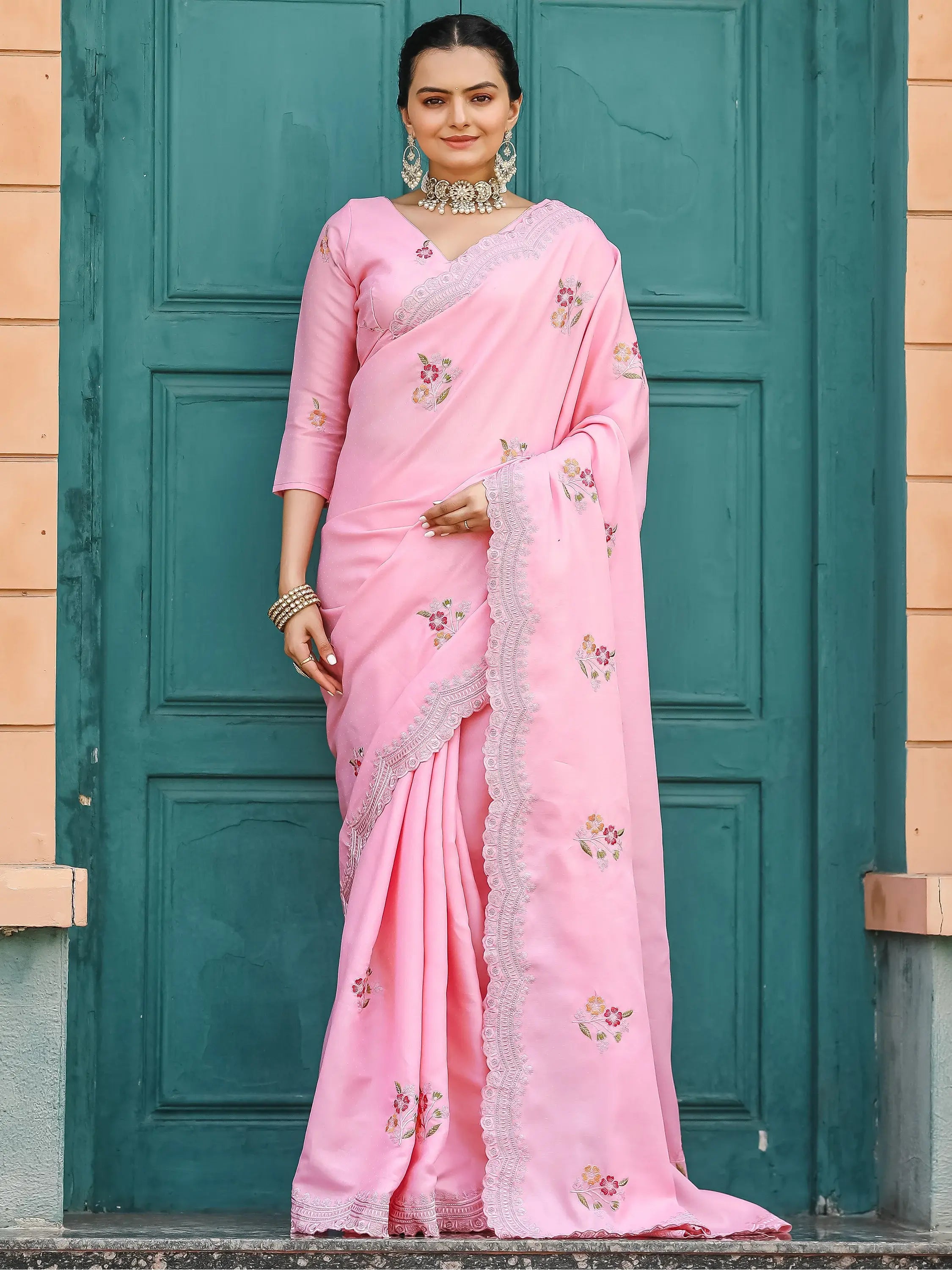 Adorable Pink Embroidered Cotton Festival Wear Saree With Blouse