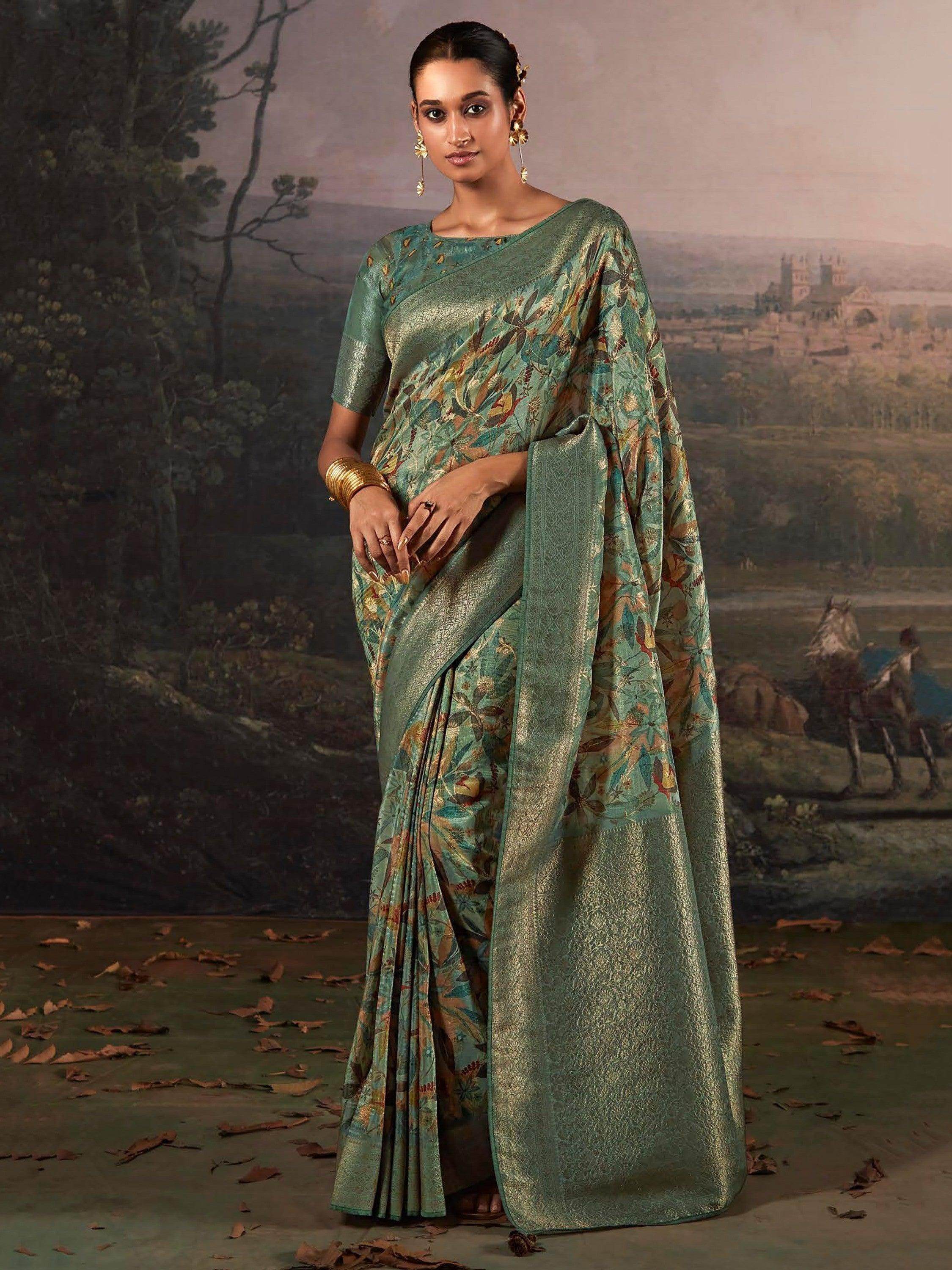 Attractive Green Floral Printed Silk Festive Wear Saree With Blouse