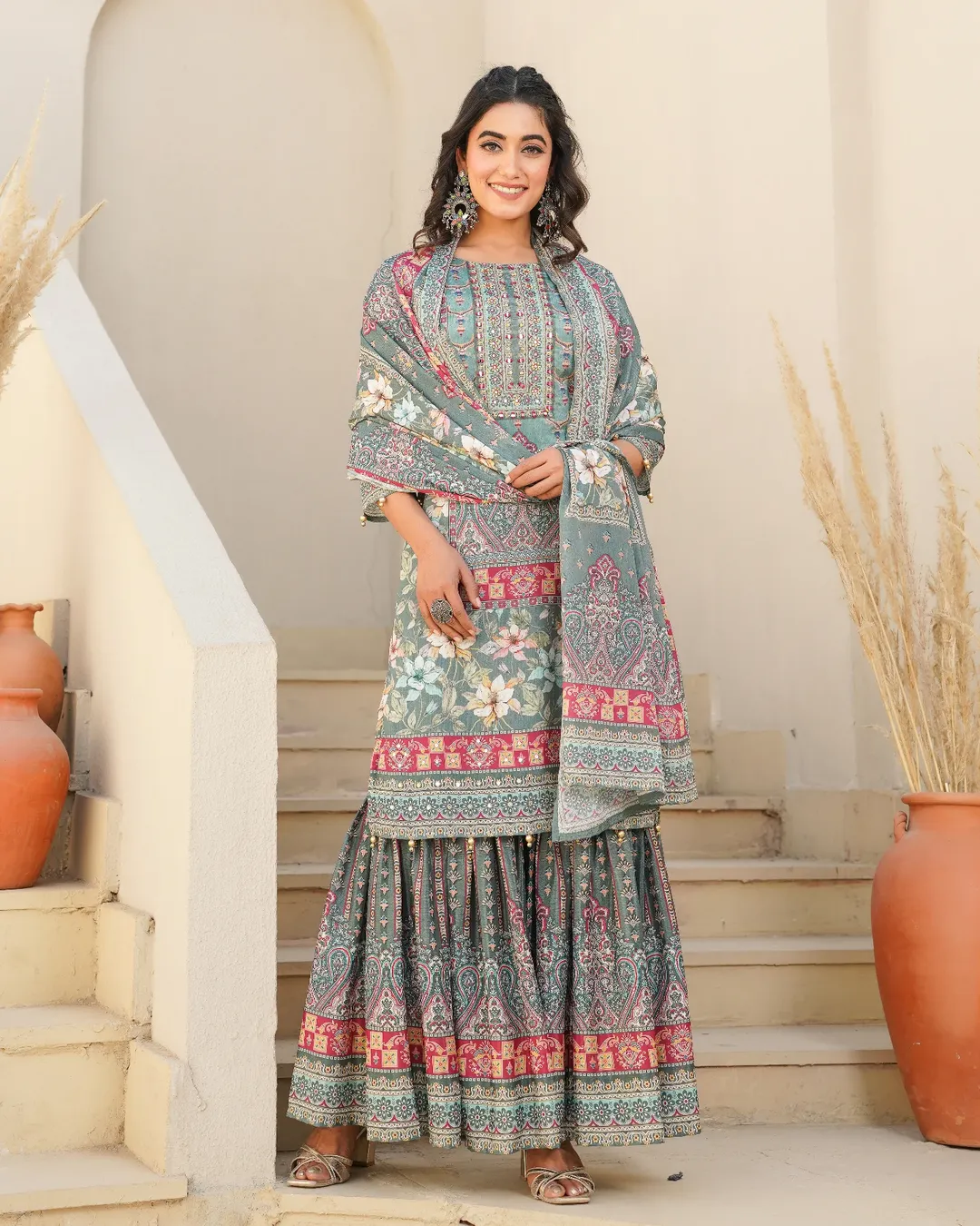 Turn heads this season with this stunning 3-piece ensemble, a perfect blend of tradition and modern grace. Crafted in premium Chinon fabric, the outfit features a seafoam green base adorned with delicate floral motifs and intricate paisley borders in rich tones of pink, ivory, and teal. The straight-cut shirt showcases a beautifully patterned front panel and detailed sleeves, while the flowy sharara-style pants add movement and charm. The look is completed with a matching printed dupatta, adding a touch of regal elegance.