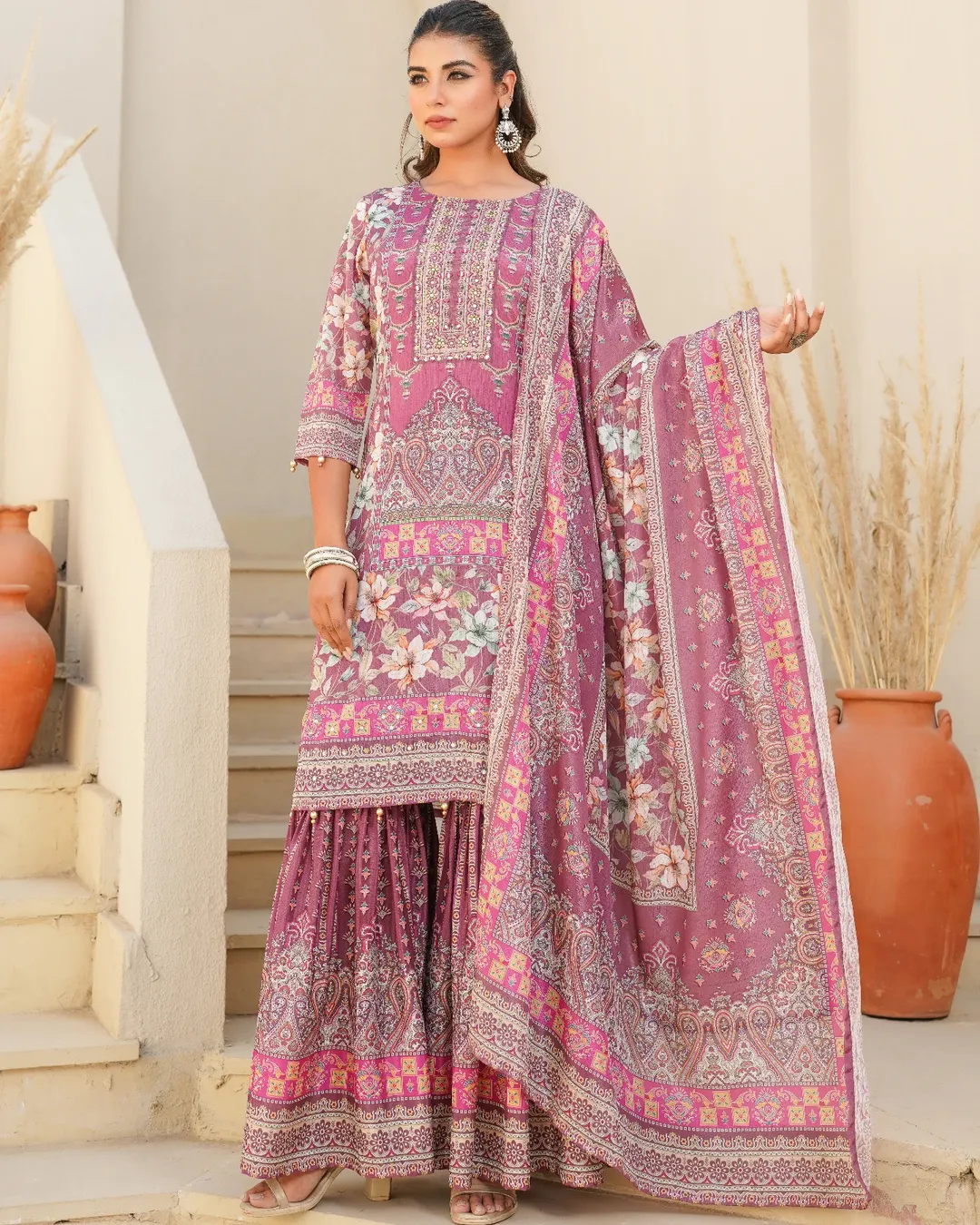 Includes: Shirt, sharara pants, and dupatta