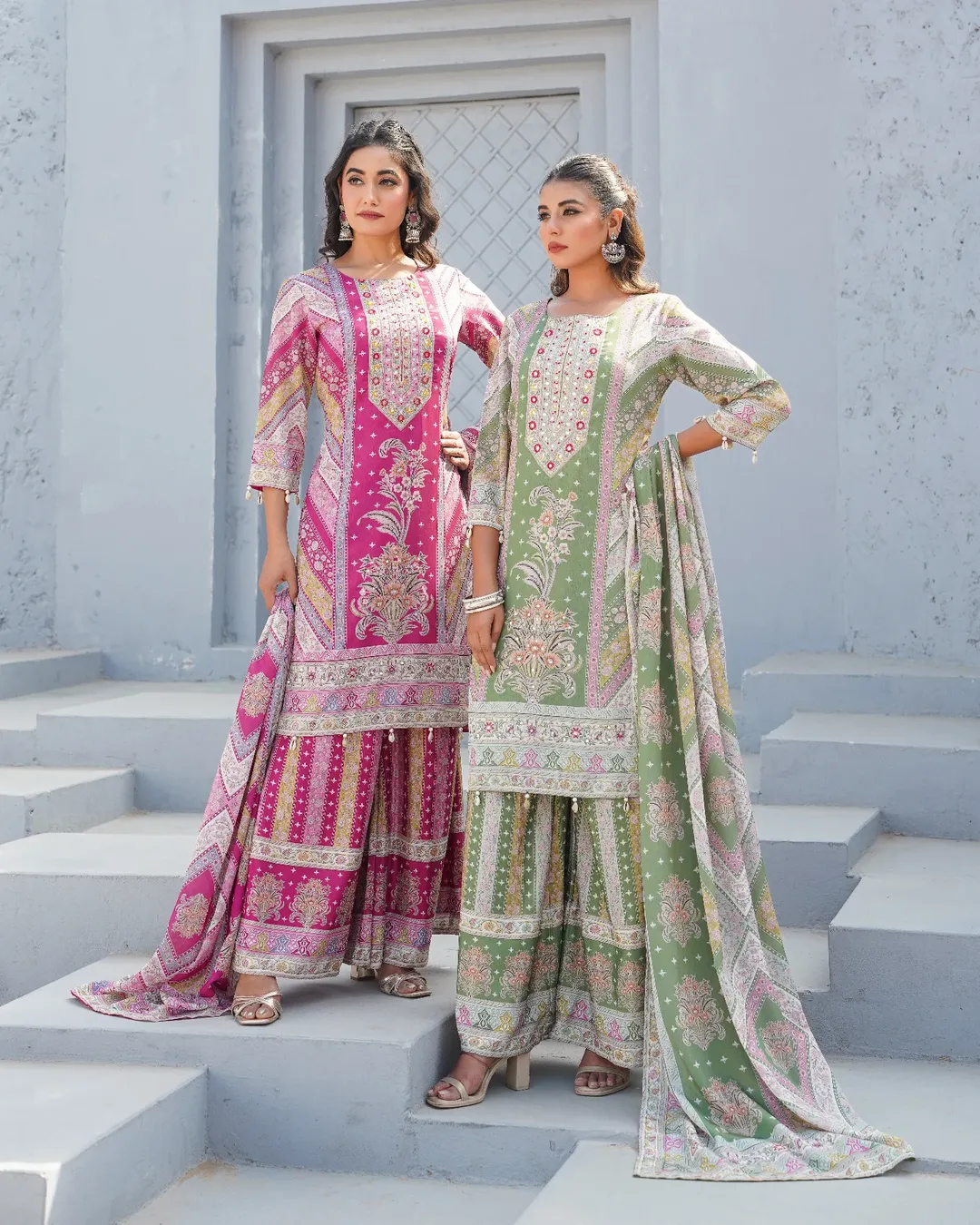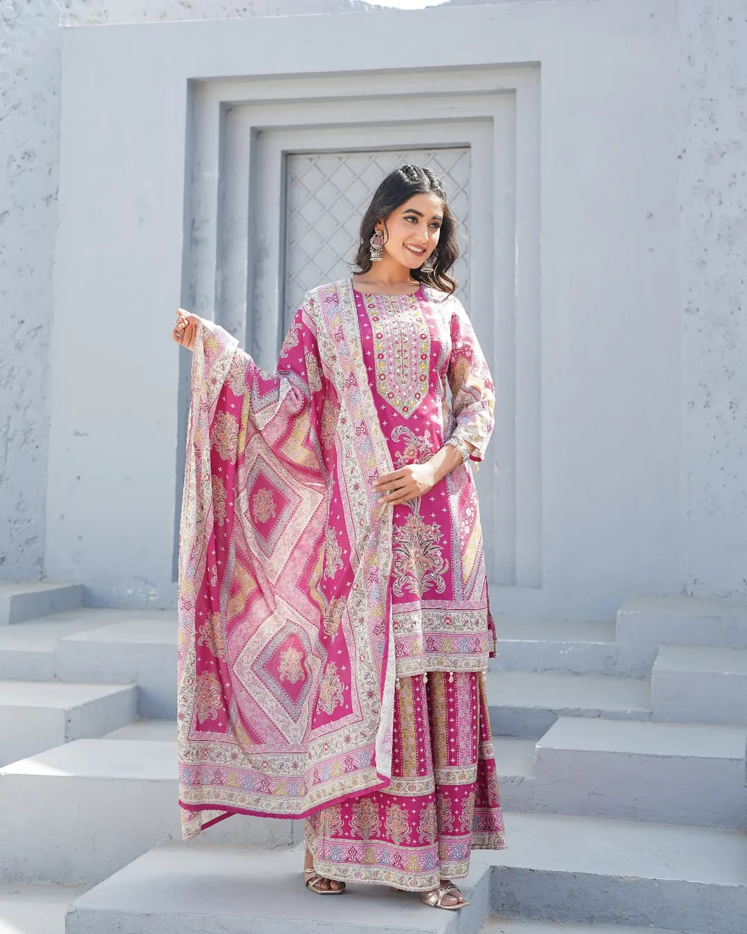 Step into timeless charm with this vibrant 3-piece Chinon outfit, glowing in a rich magenta-pink hue adorned with intricate floral embroidery and traditional border detailing. The shirt boasts a bold central motif and mirror-inspired print accents that elevate the neckline with a festive sparkle. Paired with wide-legged sharara pants featuring regal paisley and star patterns, and completed with a matching printed dupatta framed in elaborate patterns — this ensemble is a celebration of color and heritage.