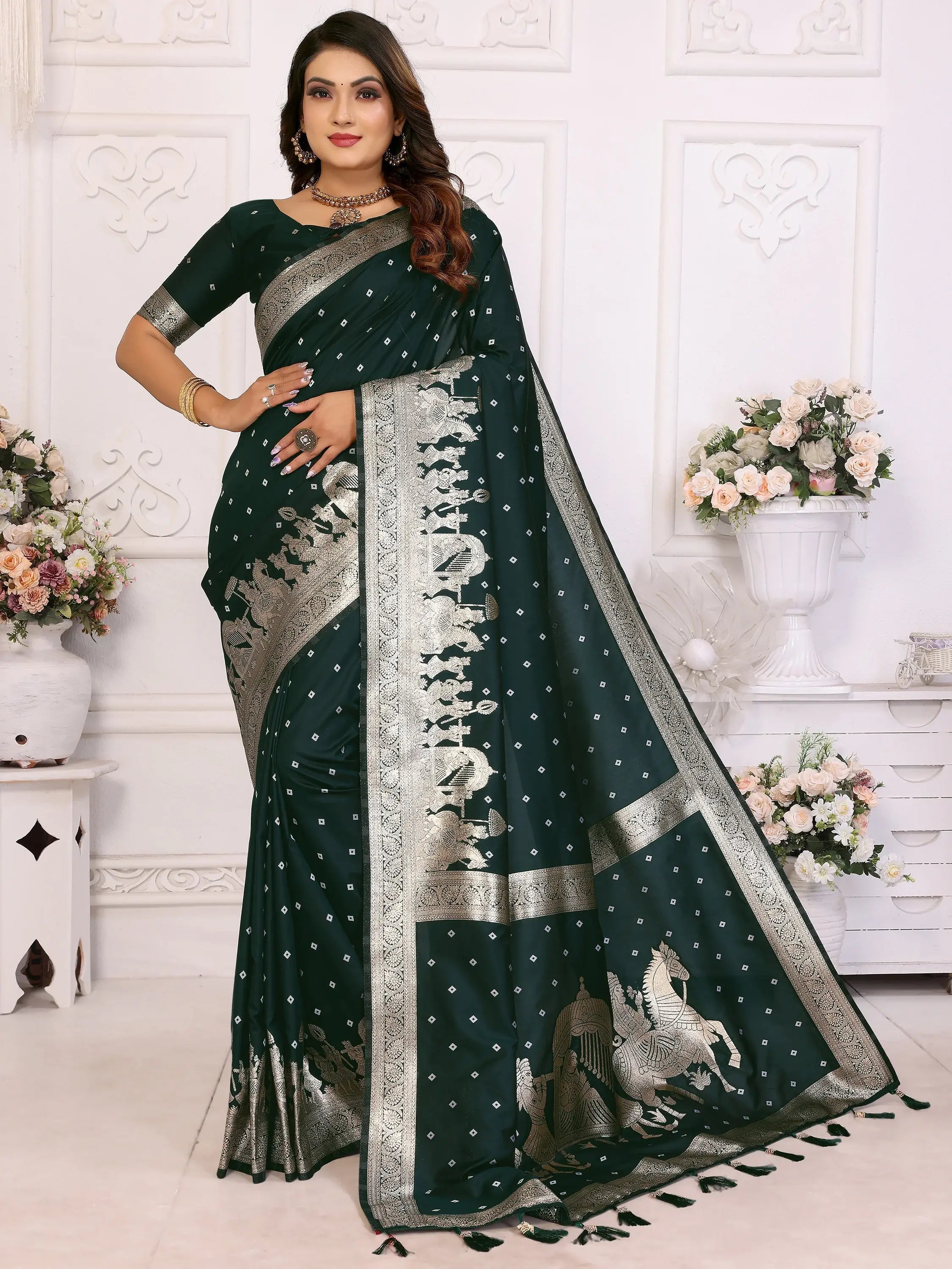 • Drape yourself in elegance with this captivating bottle-green kochi silk saree, featuring exquisite zari weaving and a mesmerizing bandhej design. The rich silk fabric enhances its luxurious appeal, making it a perfect choice for festive and mehendi wear.