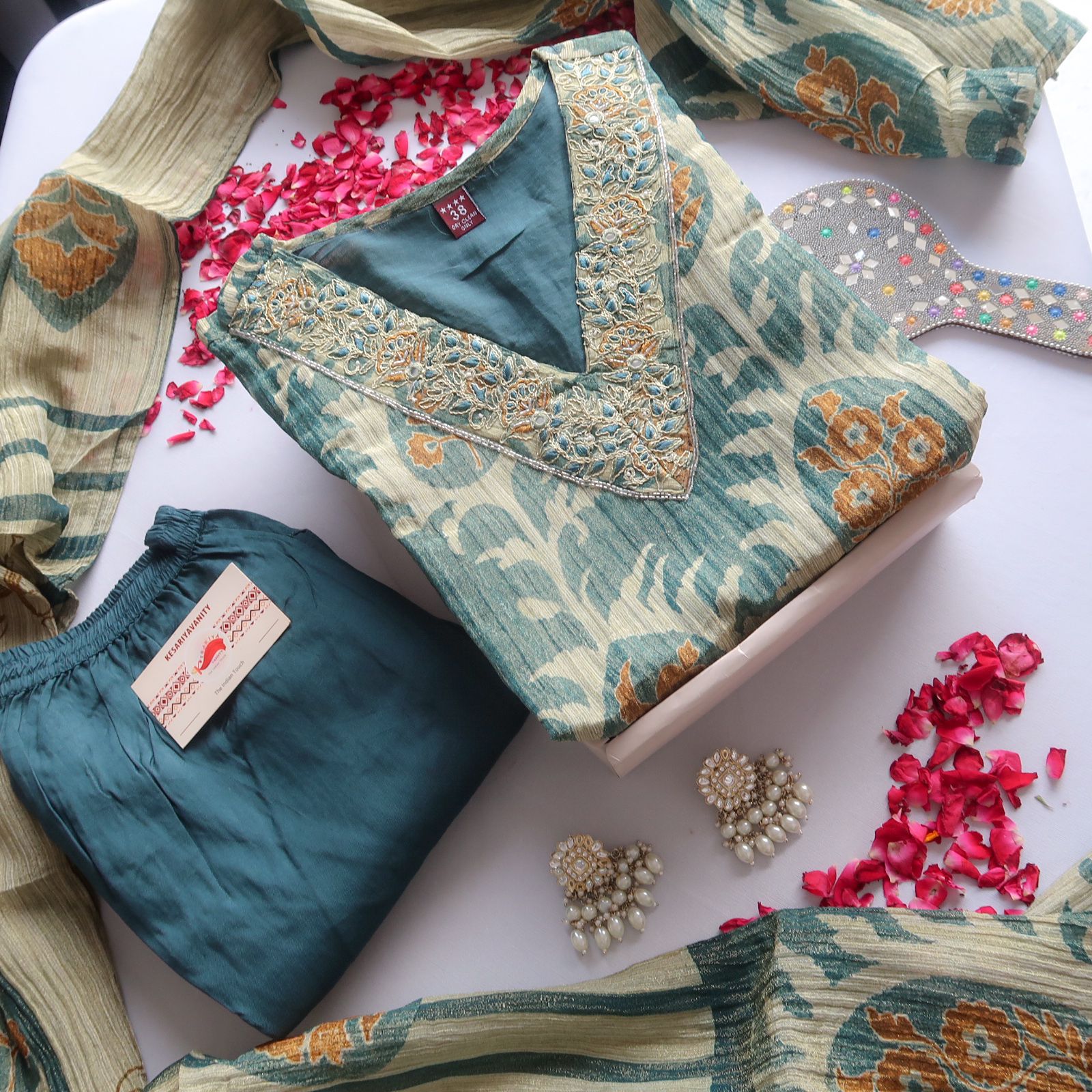 Introducing our Premium Three-Piece "Emerald Harmony Suit Set," a stunning blend of light and dark green shades for a captivating festive look. The kurta features a graceful gradient of green hues, adorned with intricate pittan work on the V-neckline, adding a touch of traditional craftsmanship.