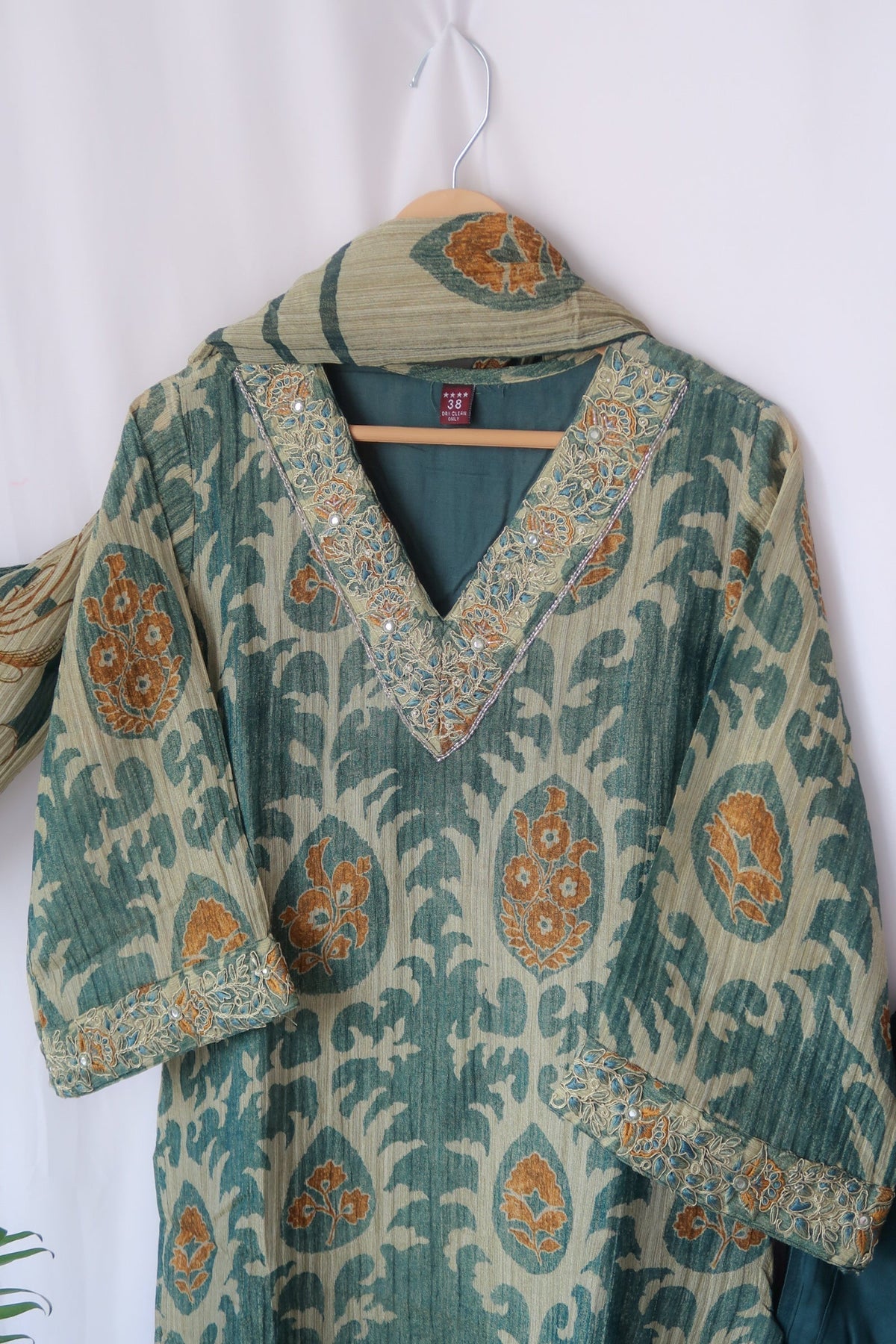 Paired with dark green plain pants, this ensemble offers both sophistication and comfort. Completing the look is a beautifully coordinated dupatta in matching light and dark green shades, bringing depth and elegance to the outfit. Perfect for festive occasions, this suit set radiates a harmonious mix of tradition and style.