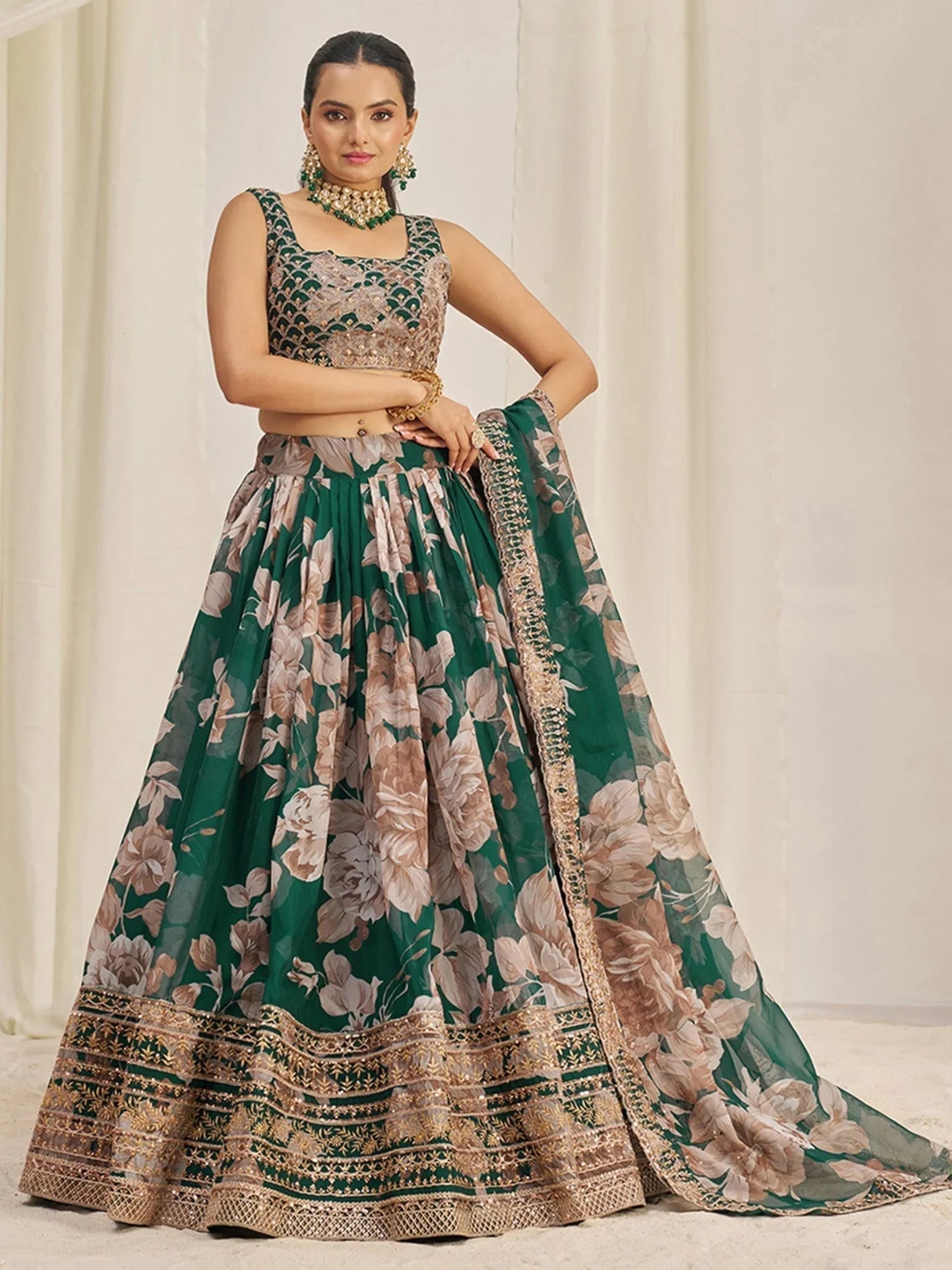 Experience the epitome of elegance with our Green Organza Lehenga Choli Set, designed to exude sophistication at weddings, receptions, and festive occasions.