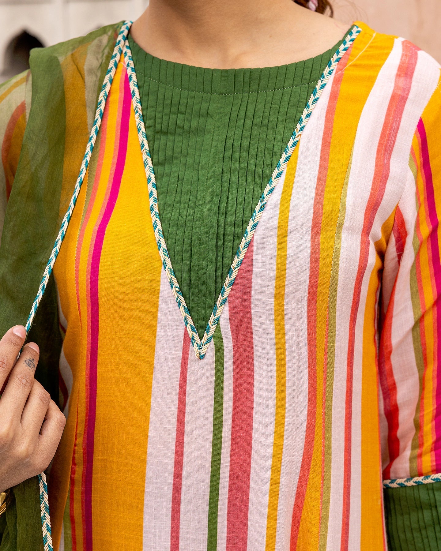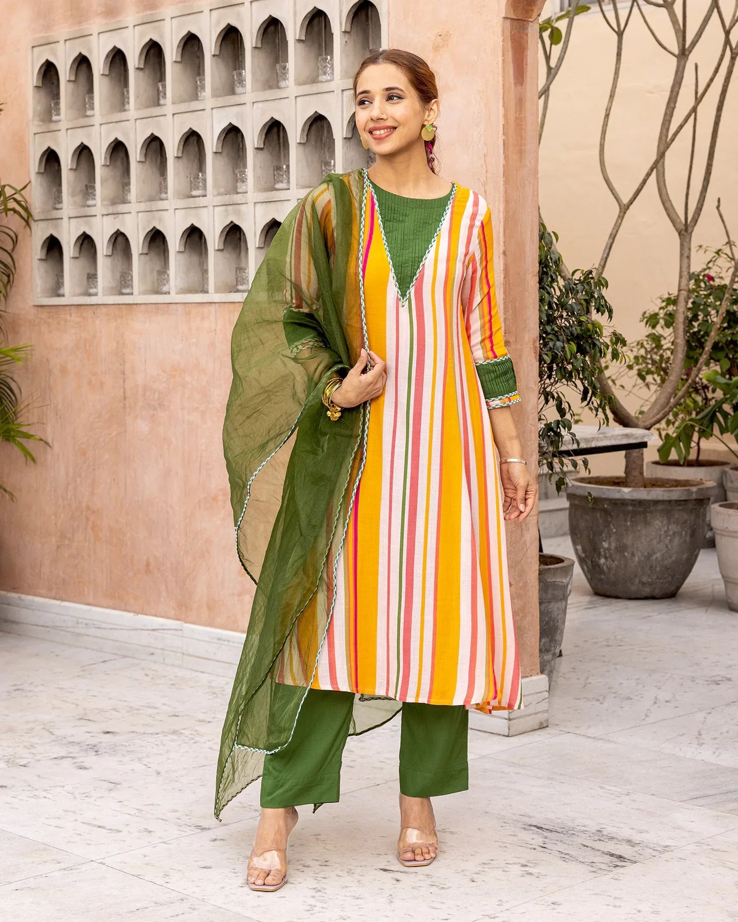 Serve a suave and oomph-worthy appeal in our breezy summer ensemble, accentuated with contemporary aesthetics and washed in a dopamine-inducing palette of mustard. Our 3-piece assorted suit set is crafted in a premium weave of rayon and includes round neck A-line kurta beaded with pintucks and stripes print tale, a pair of straight-fit bottoms, and a dupatta.