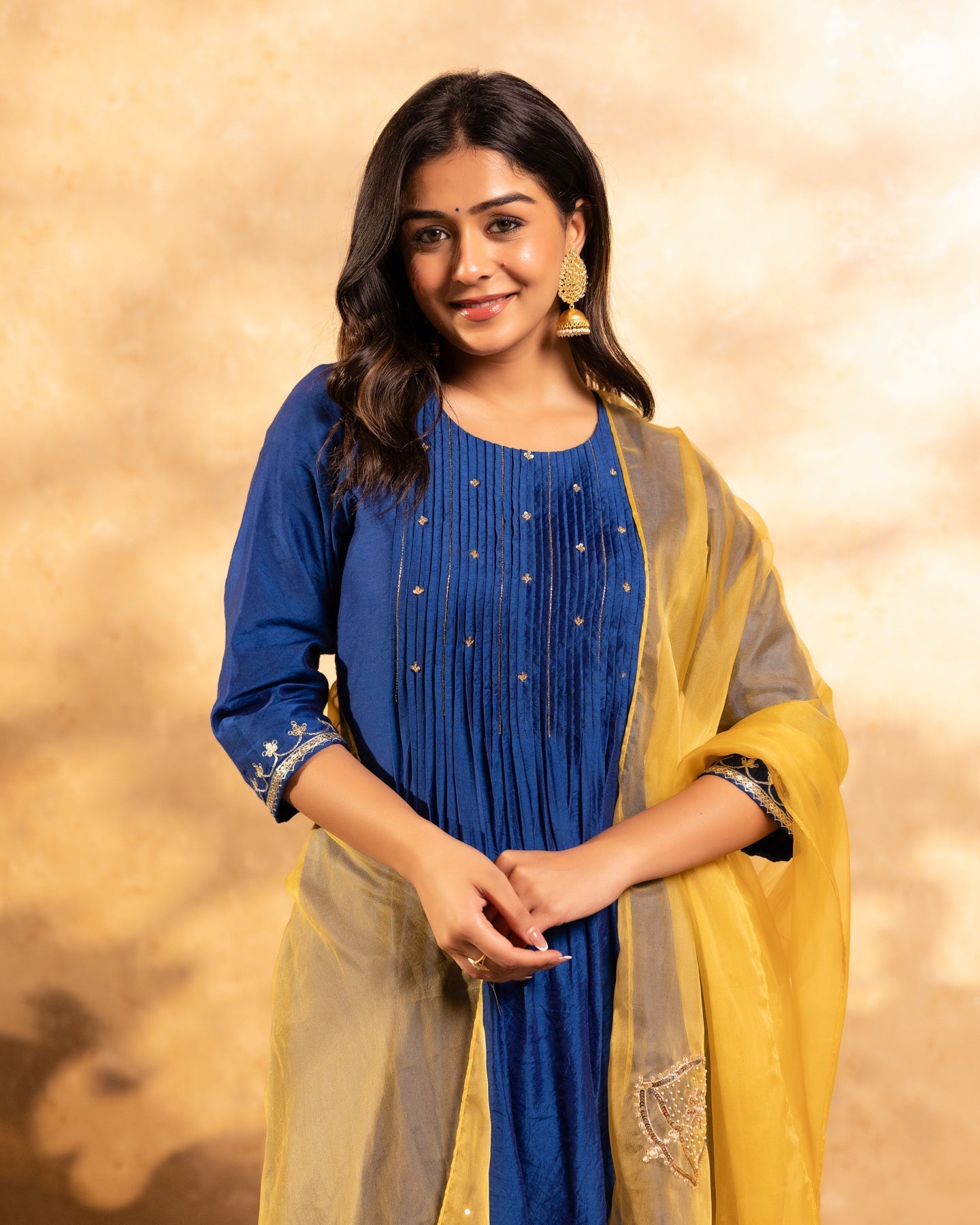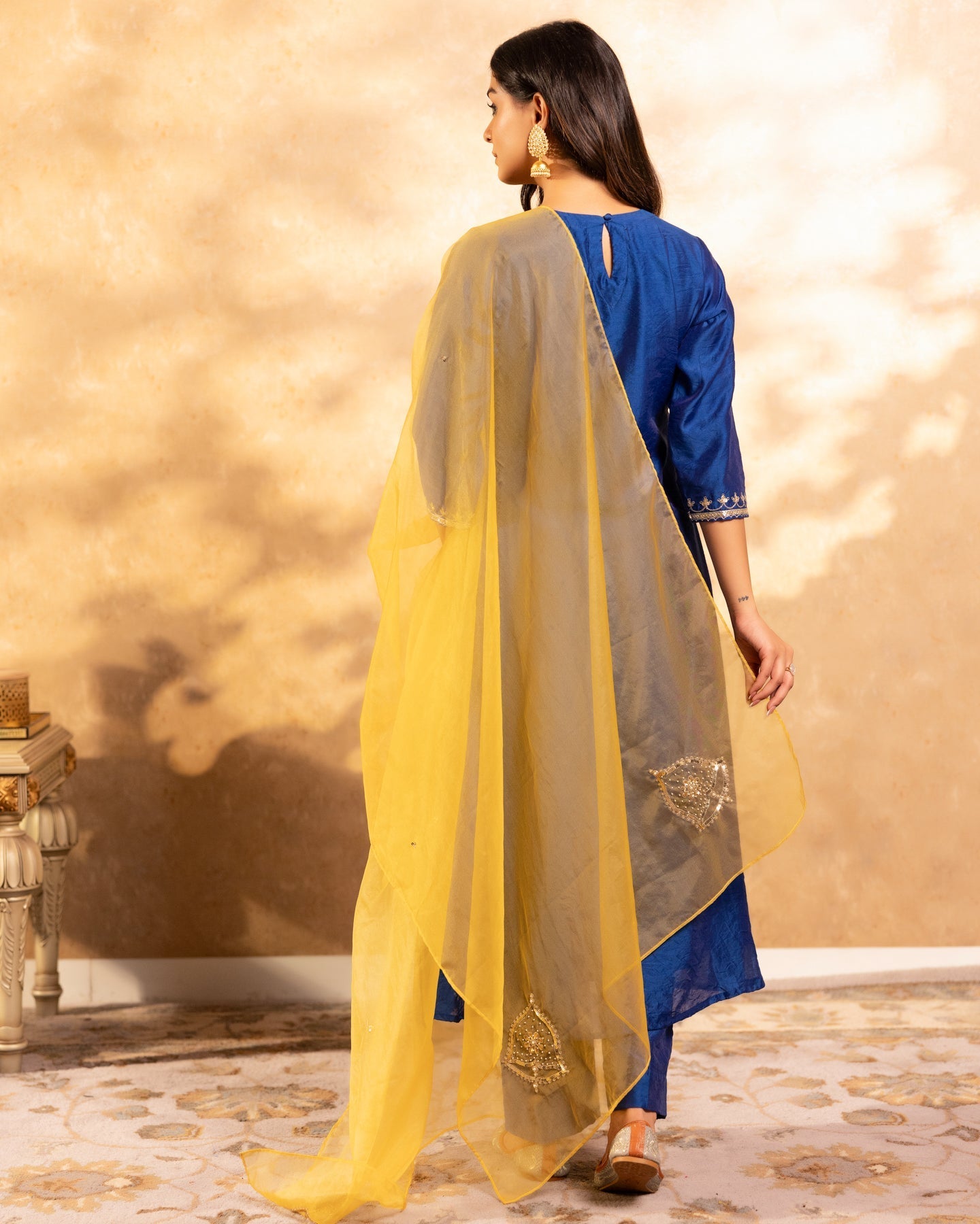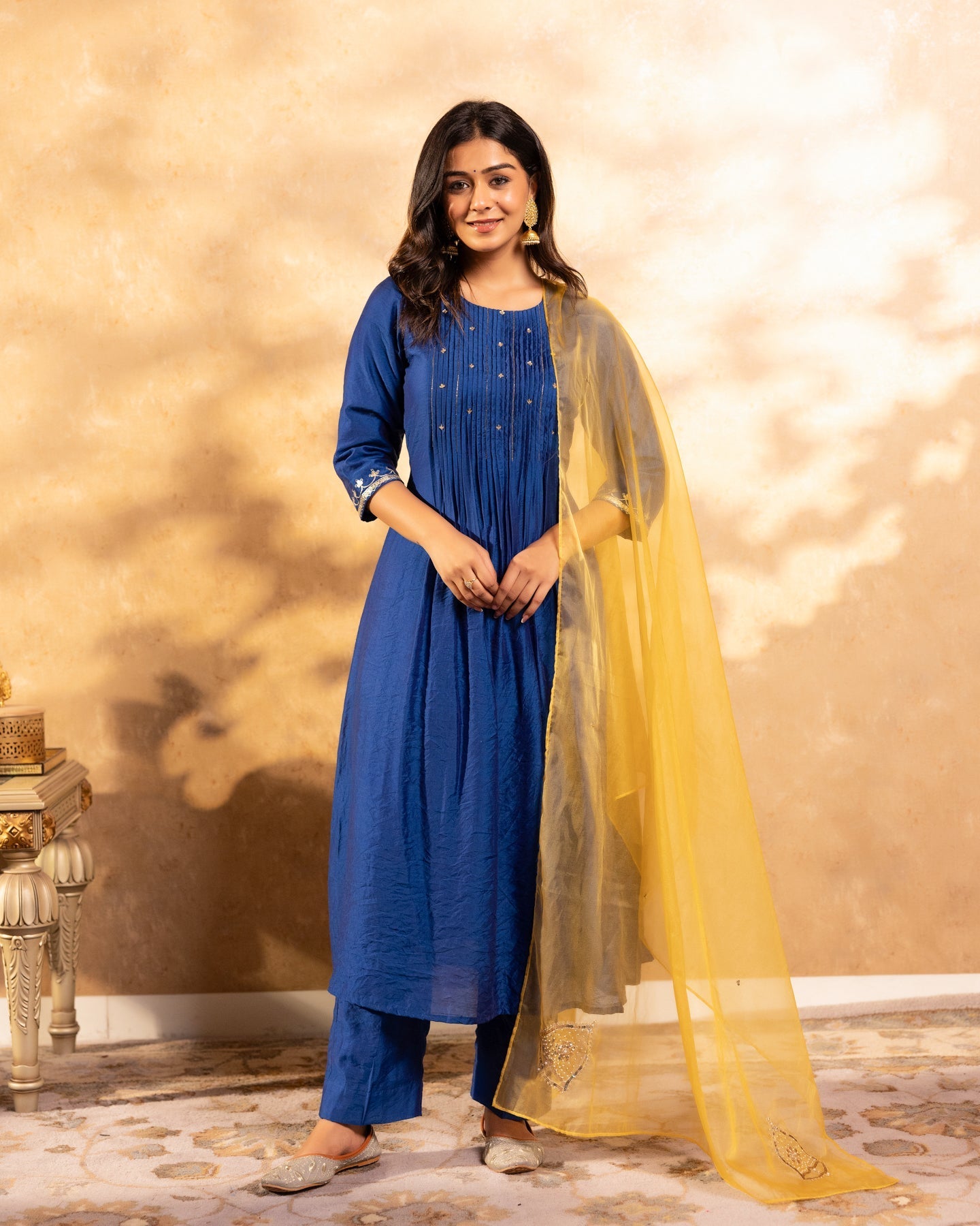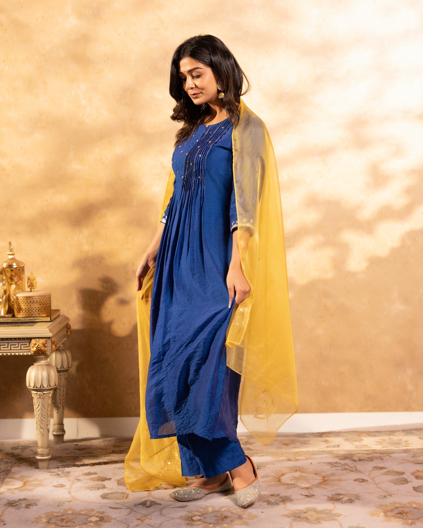 This Navy Chanderi Suit Set features intricate front pin-tuck detailing with handwork on the kurta and sleeves. Paired with straight pants and a contrasting gold dupatta adds a right amount of shine to the outfit.