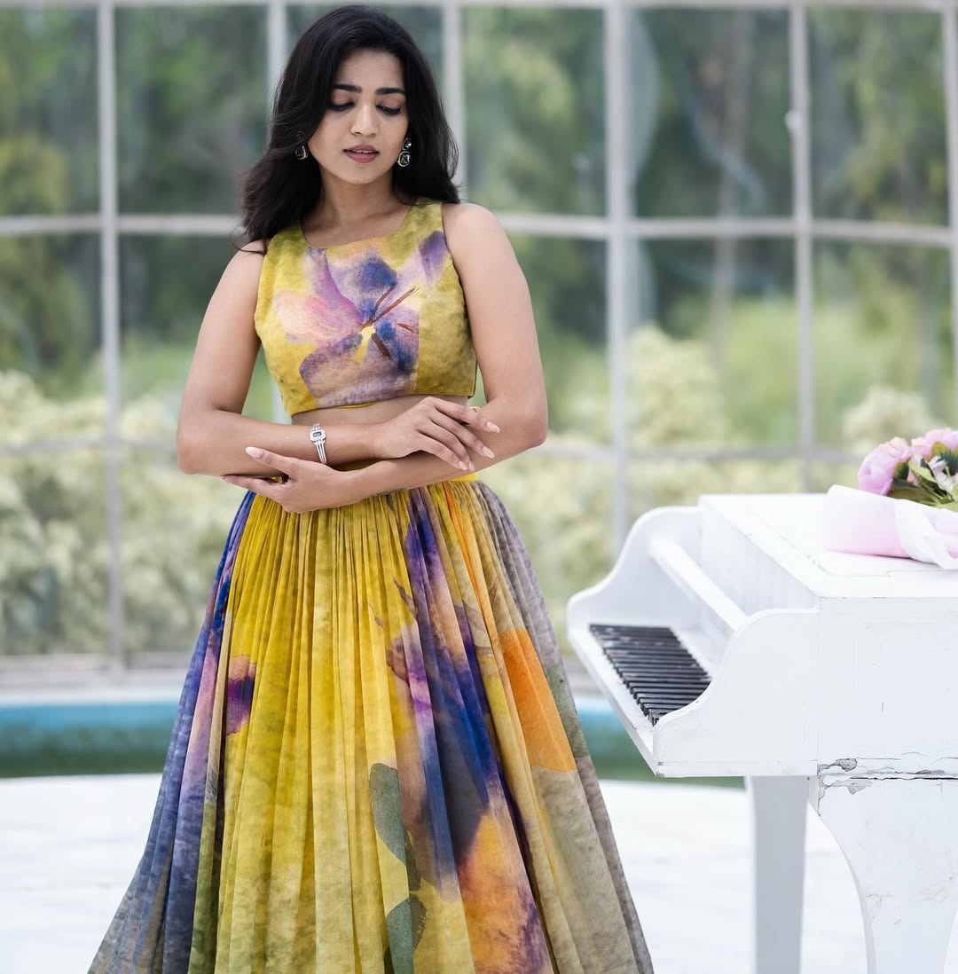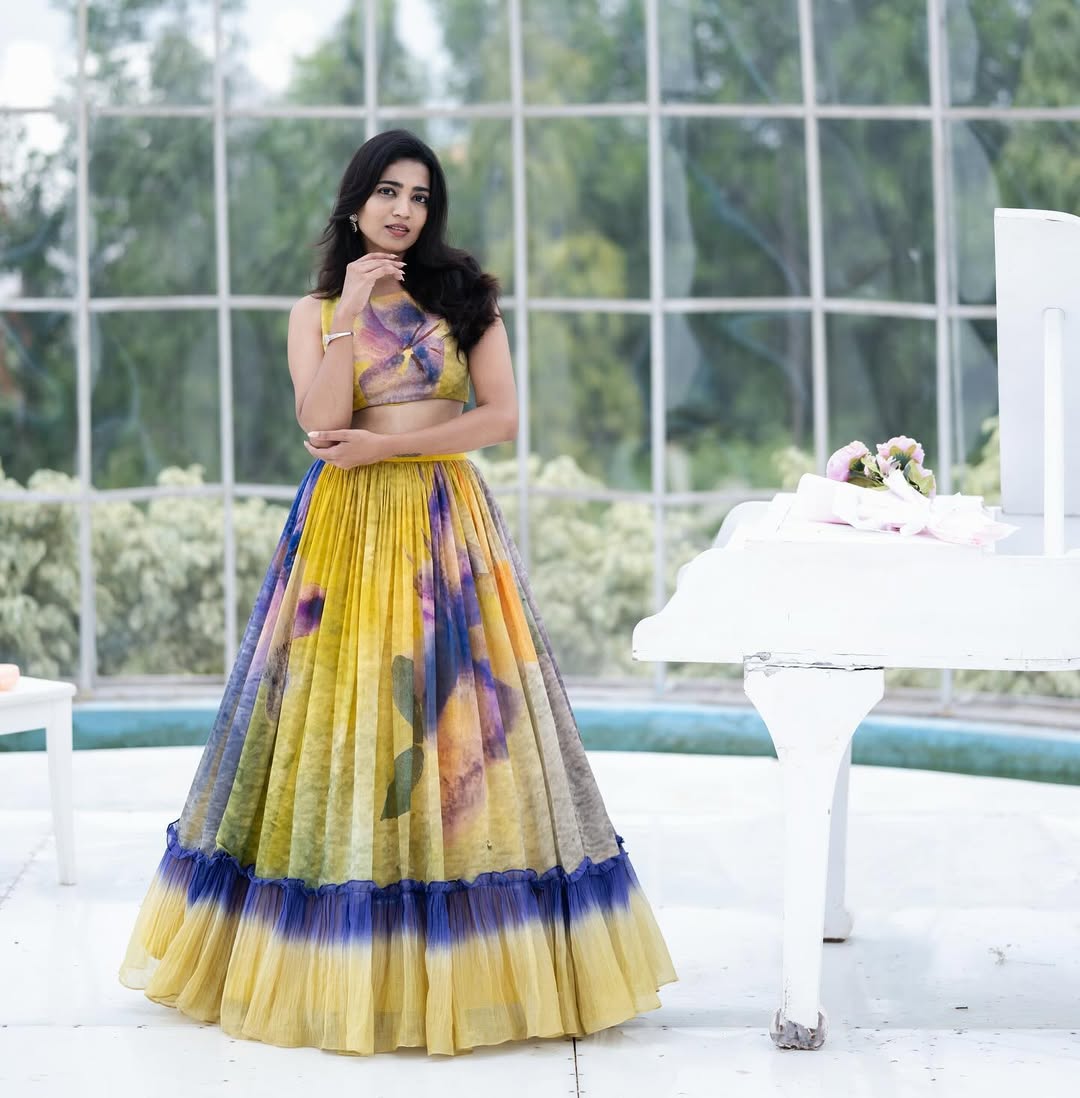 Channel vibrant elegance in this dreamy yellow lehenga set featuring artistic hand-painted floral designs in shades of violet, blue, and orange. The sleeveless crop top pairs beautifully with a voluminous lehenga that flows with rich pleats and a striking ombré blue border. Crafted from lightweight fabric with a soft shimmer, this set is perfect for outdoor celebrations, festive gatherings, or artistic pre-wedding shoots. The bold floral motifs and unique color play bring out a youthful, creative flair.