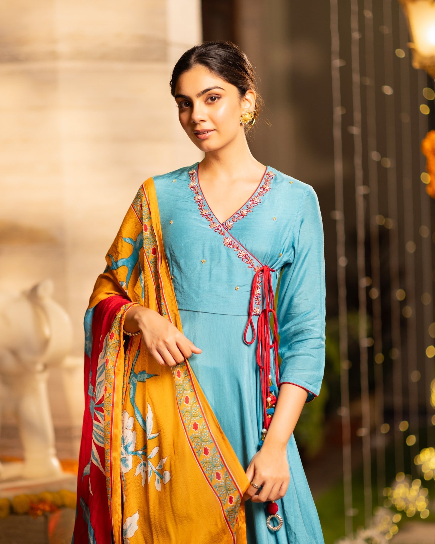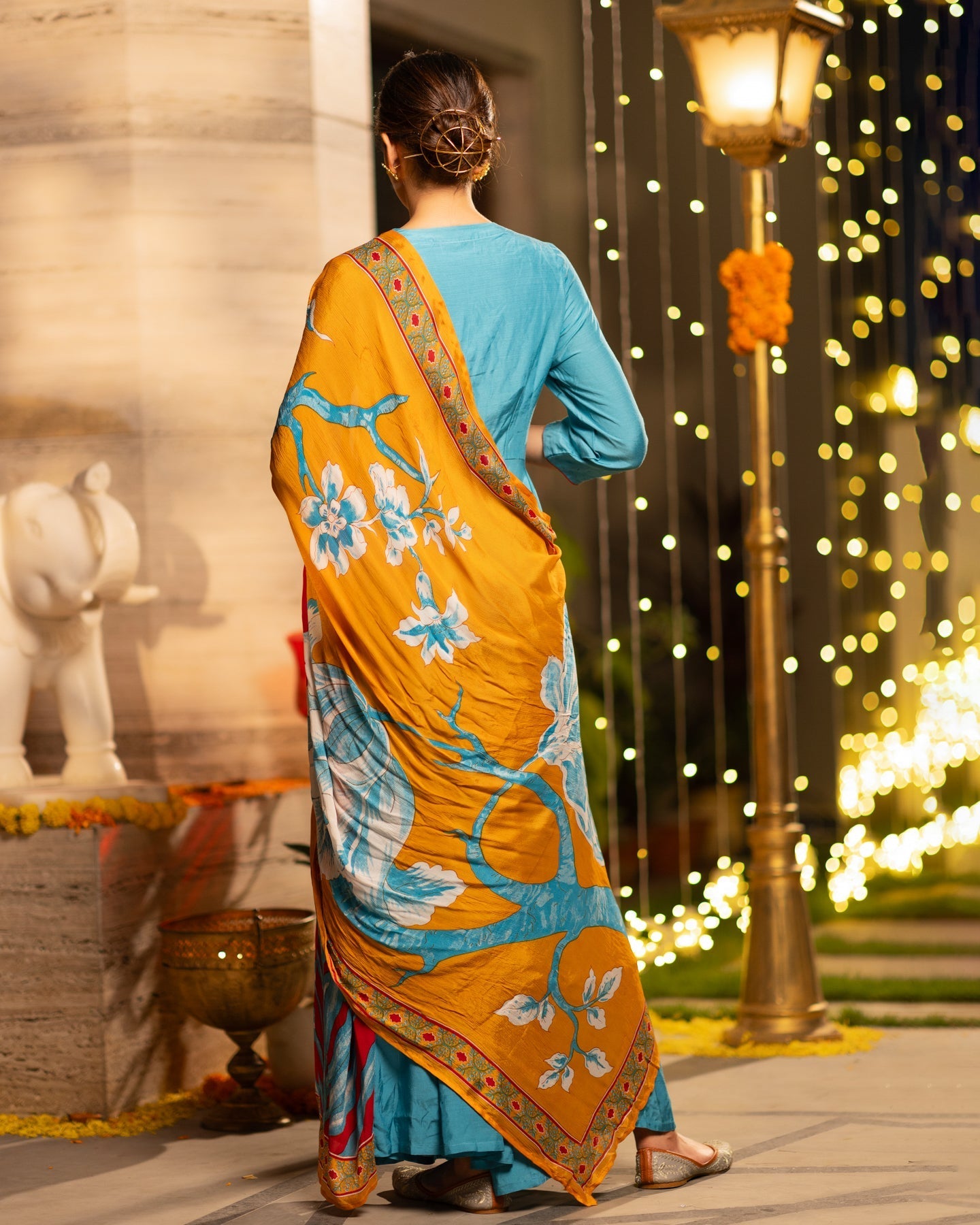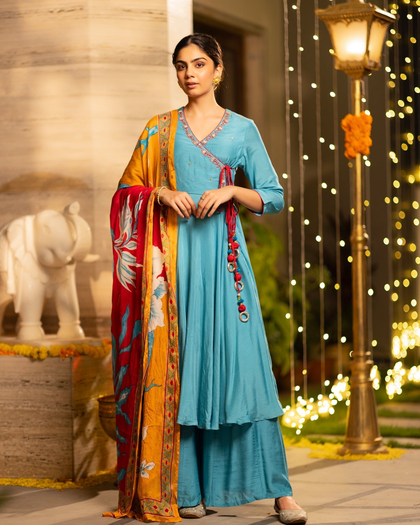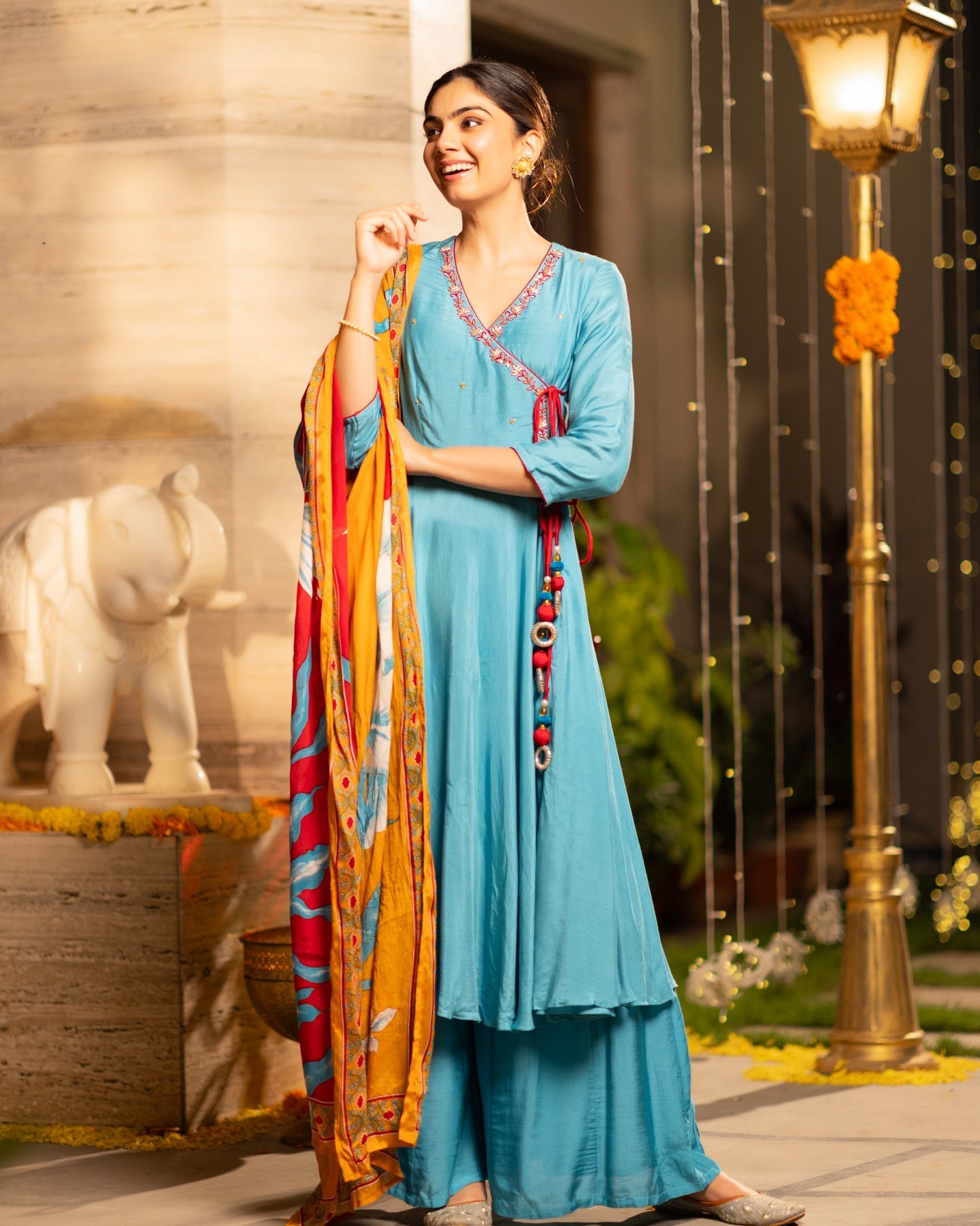 The Ocean Blue Suit Set features a wraped- styled kurta with stylish V-neckline adorned with embroidery details. The kurta is paired with flared palazzo pants and a contrasting yellow dupatta adds a vibrant pop of color.