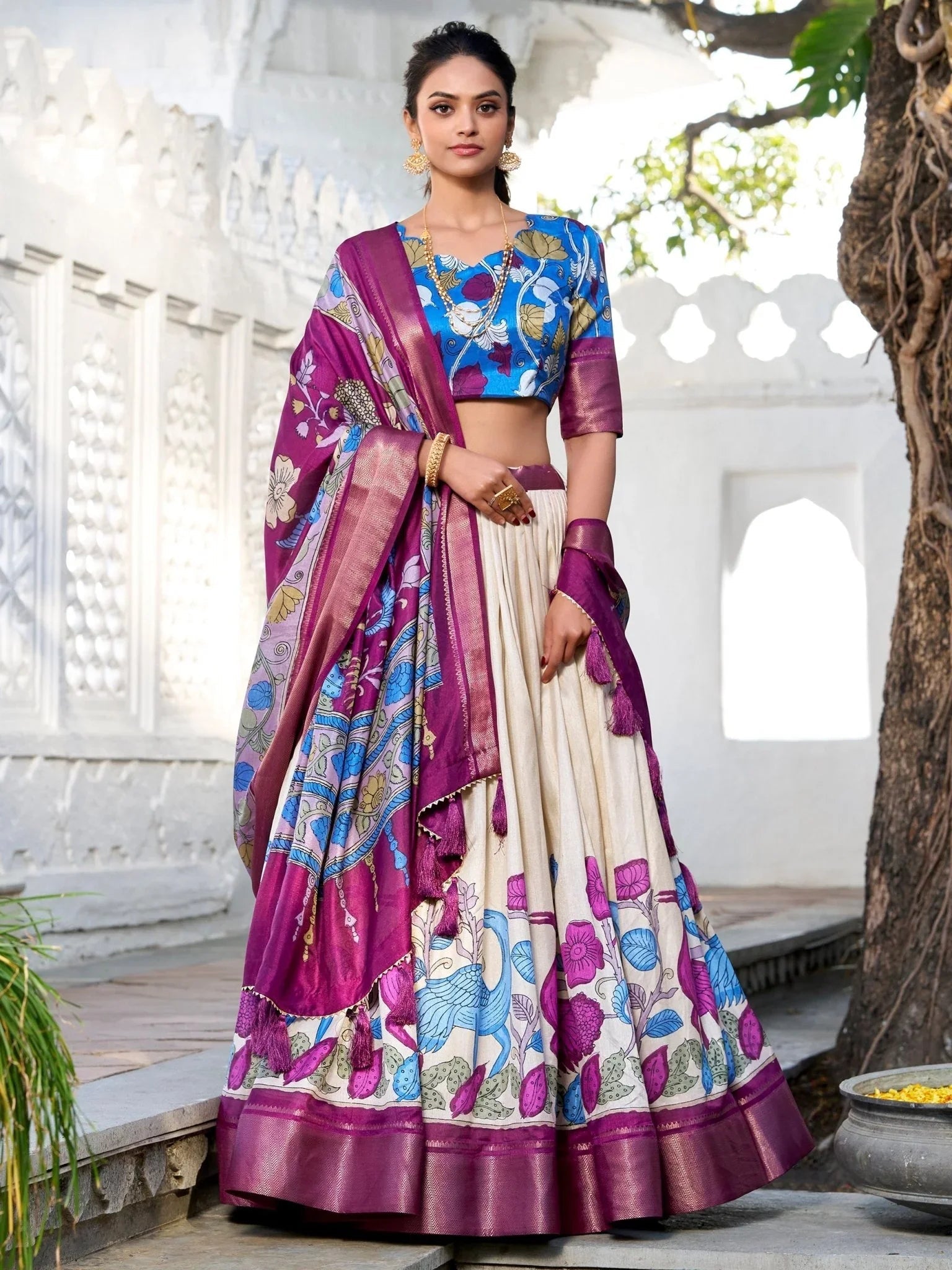 Lehenga: Off-white dola silk lehenga with intricate Kalamkari prints, zari weaving border, 3.8-meter flair, and a flowing 41-inch length, offering a graceful drape for every step.