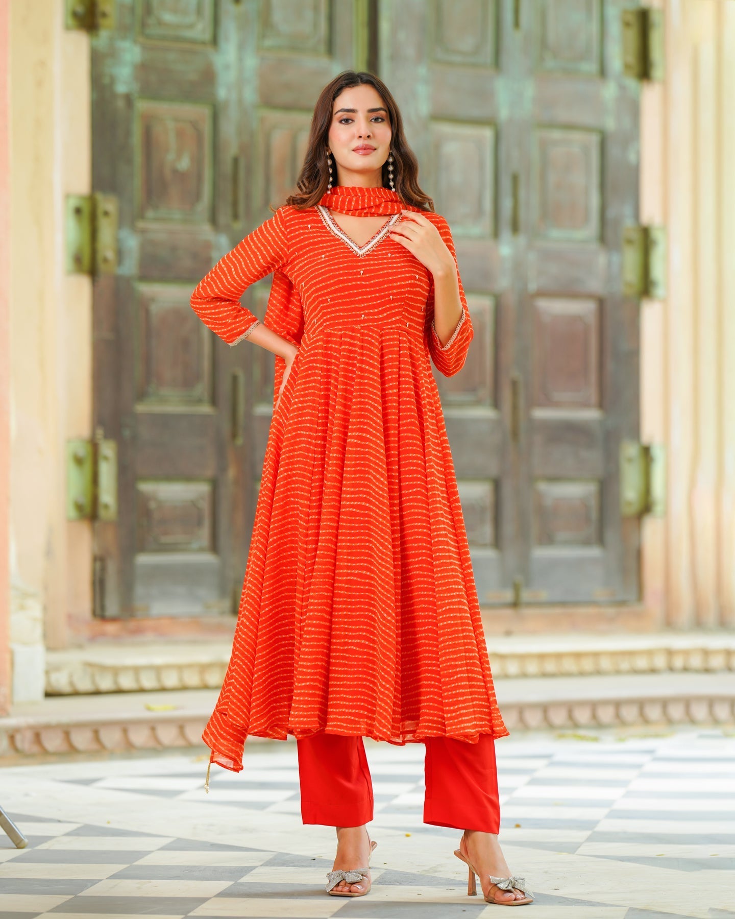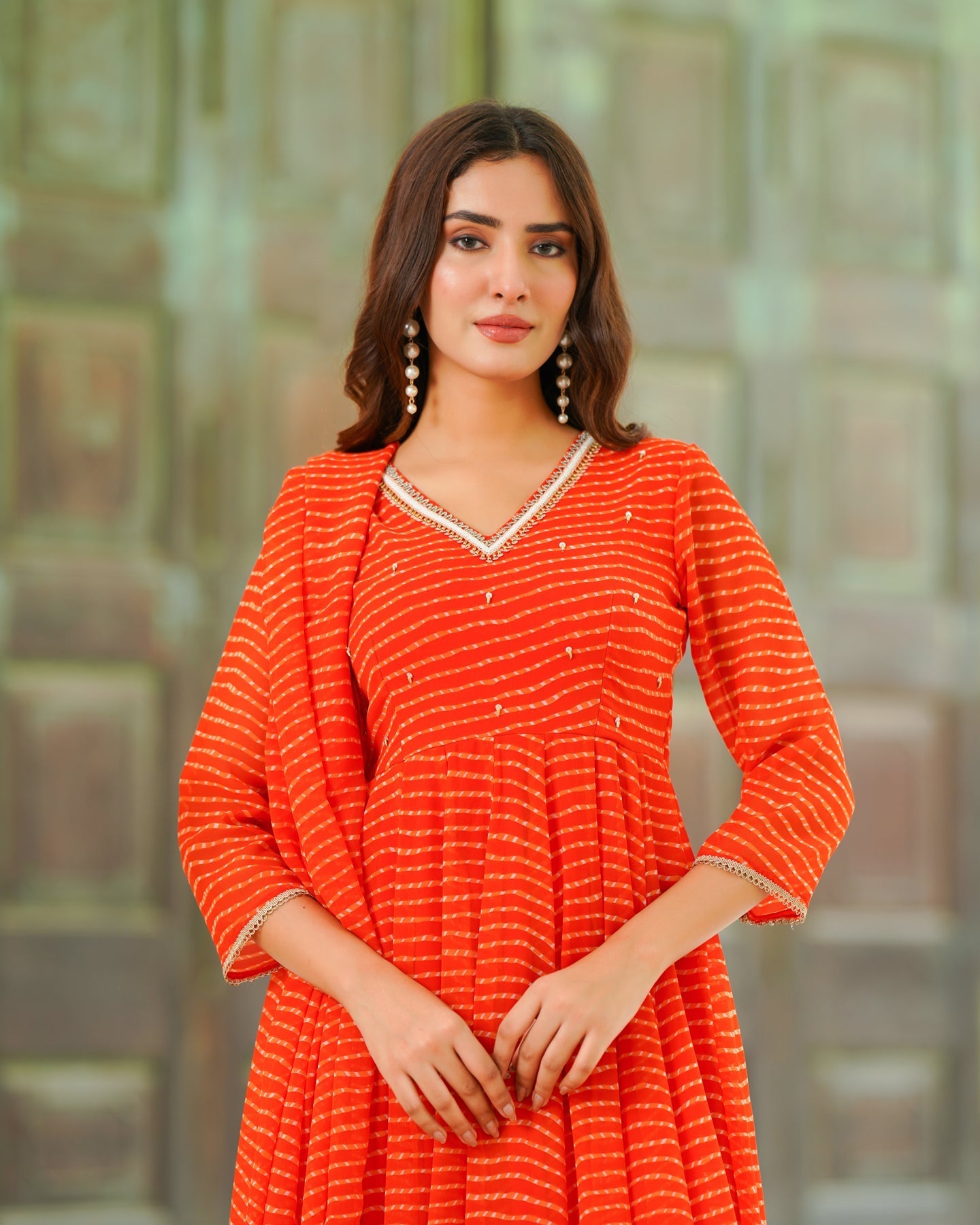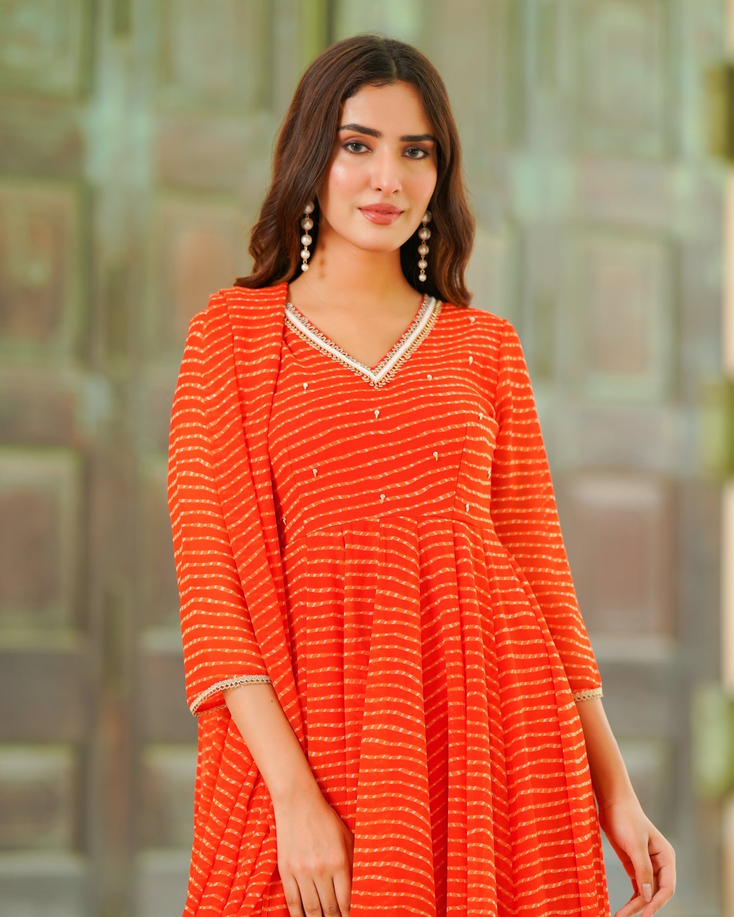 Revel in the beauty of our orange summer suit set, a versatile piece that can be dressed up or down. Our 3-piece set includes a vneck kalidaar kurta, straight pants bottoms, and a matching dupatta.