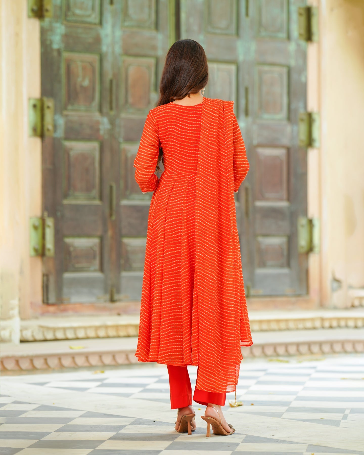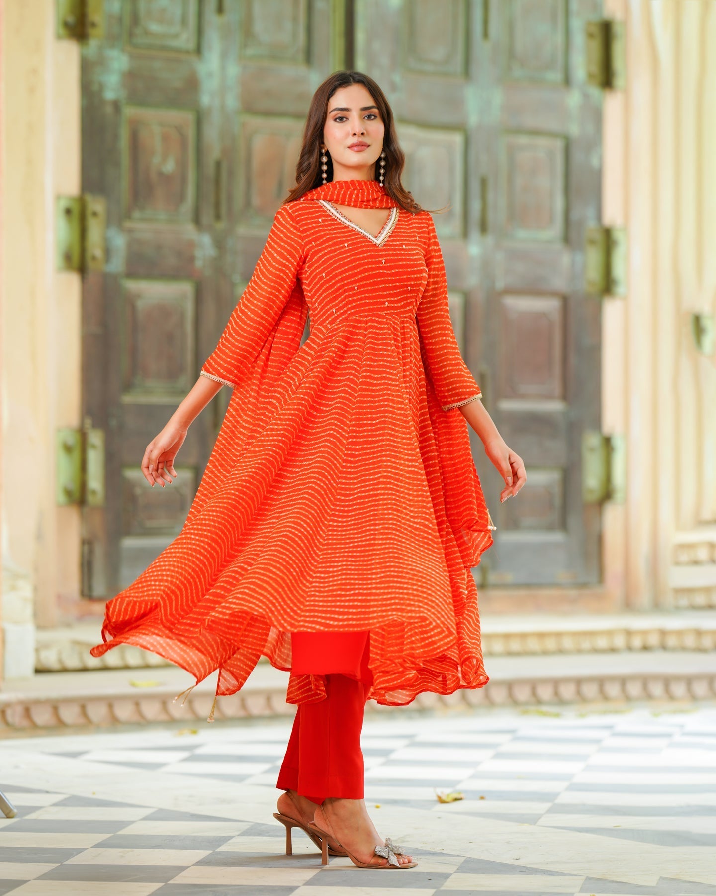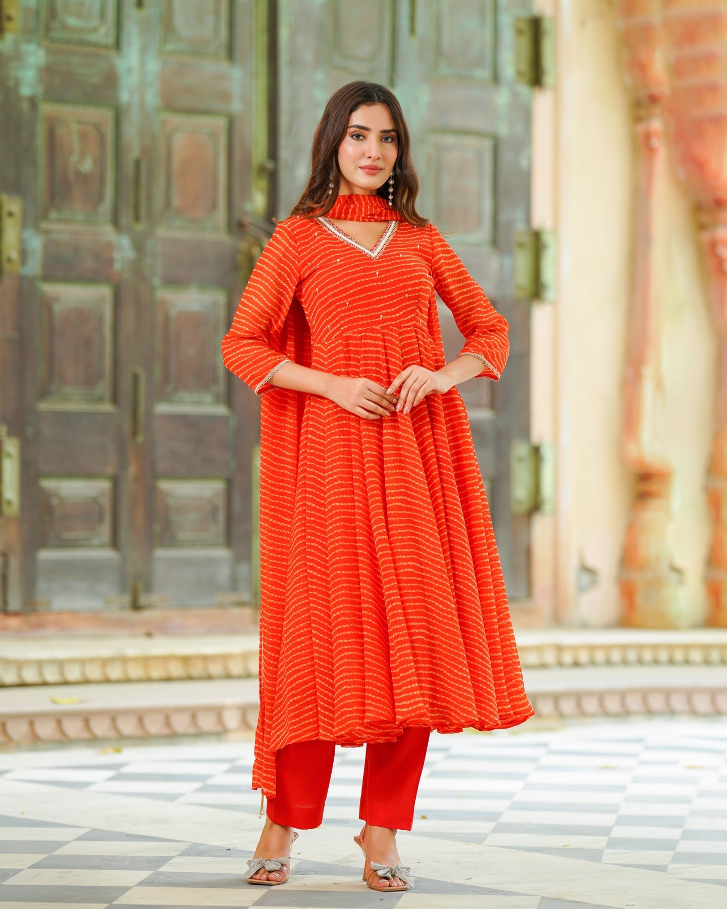 Revel in the beauty of our orange summer suit set, a versatile piece that can be dressed up or down. Our 3-piece set includes a vneck kalidaar kurta, straight pants bottoms, and a matching dupatta.