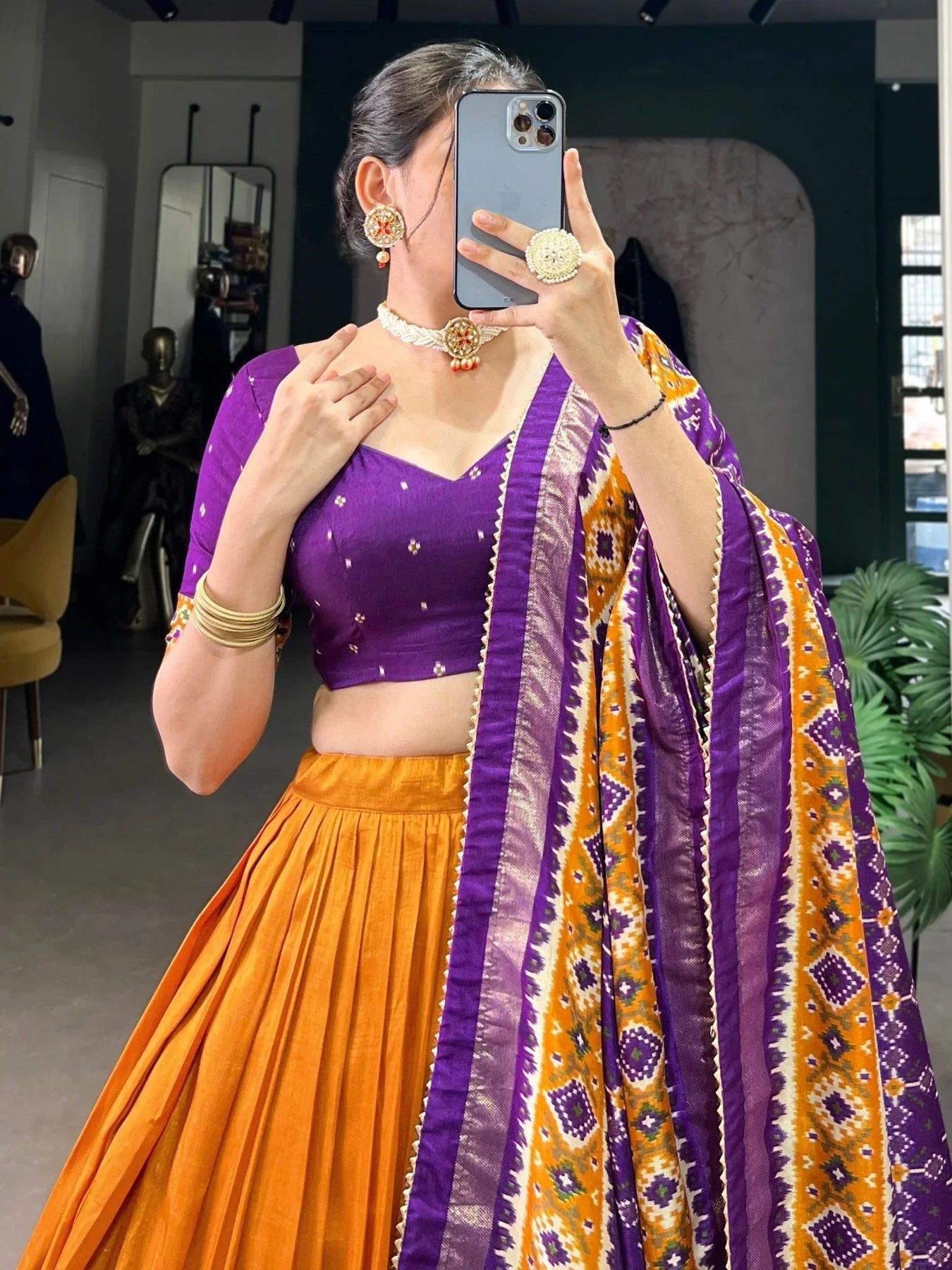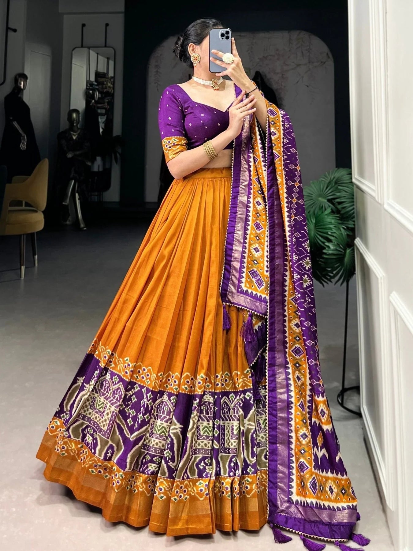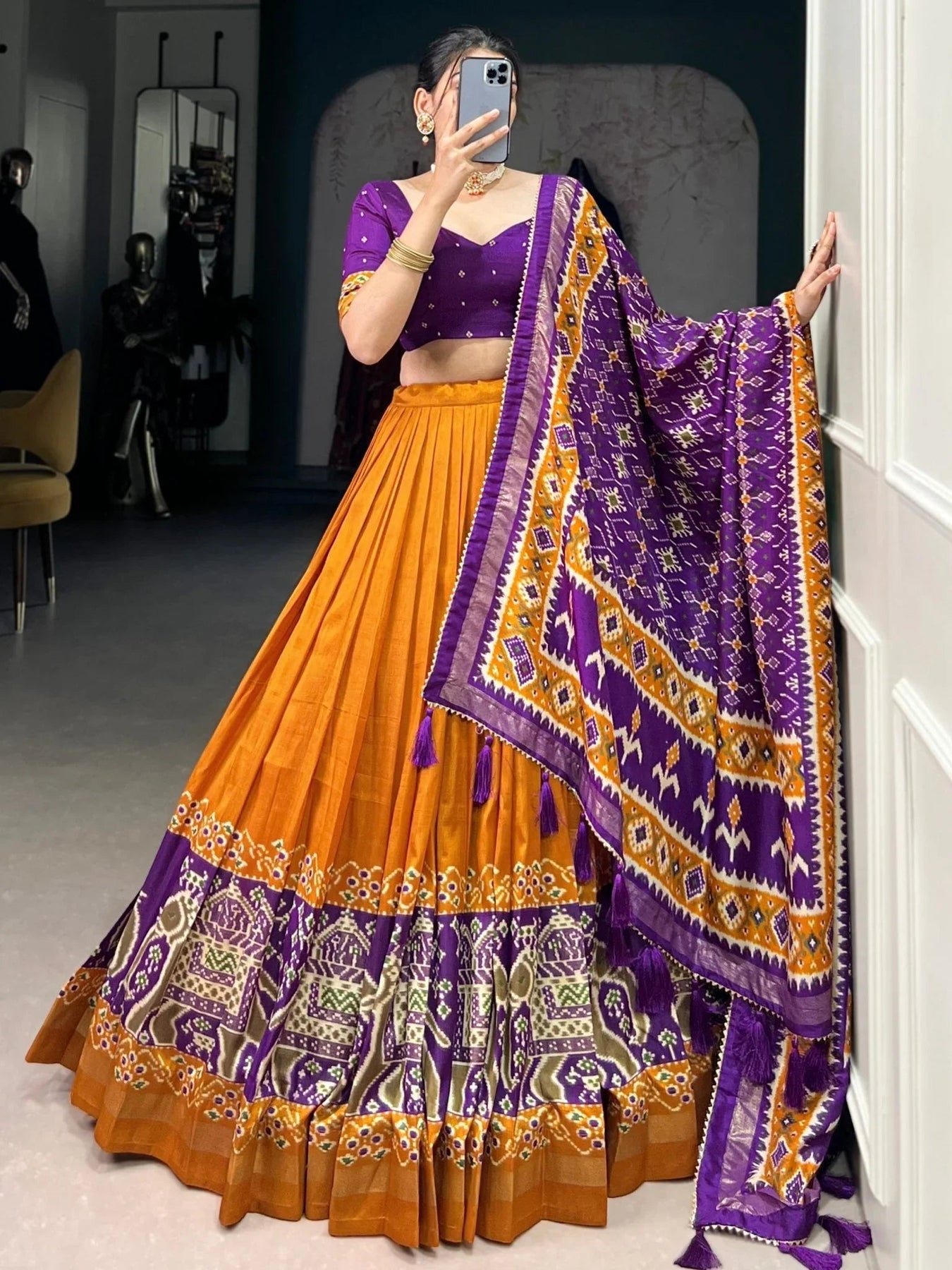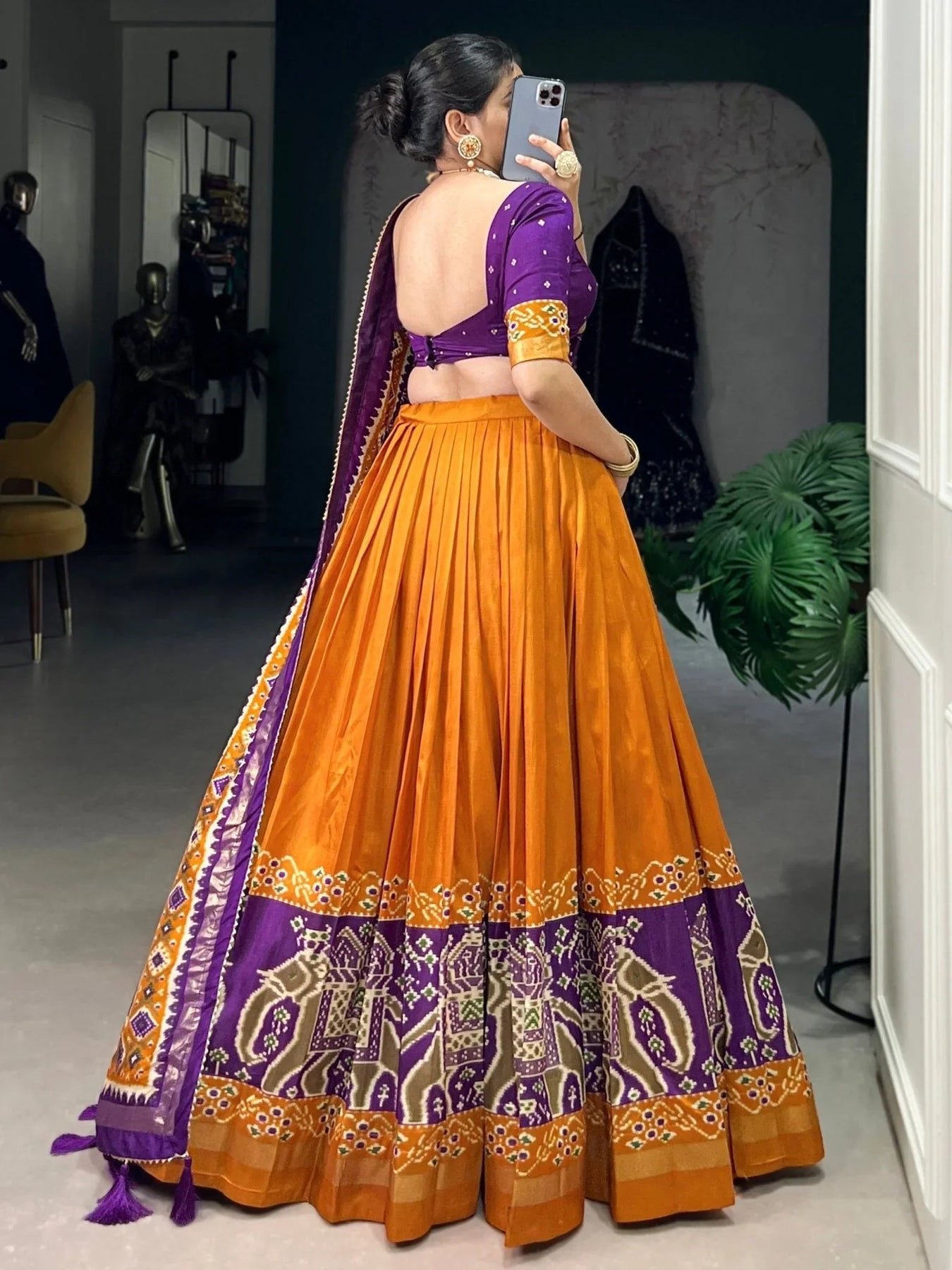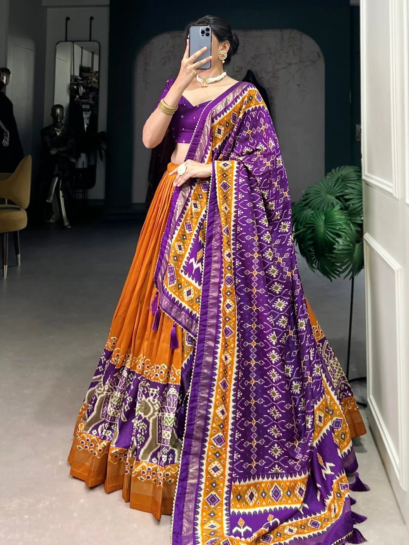 Celebrate tradition in vibrant style with this orange Patola-printed Tussar Silk lehenga choli set. Expertly crafted, it combines rich fabric, striking colors, and intricate detailing to make a memorable festive statement.