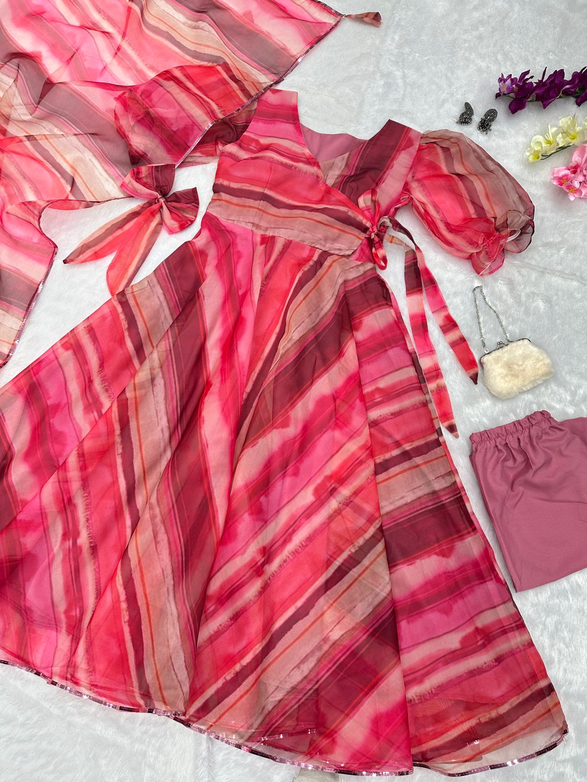Make a statement with this Organza Silk Anarkali Suit, featuring a vibrant digital print and huge flair finished with a delicate lace border. The fully stitched gown offers an elegant silhouette, perfect for festive occasions, parties, or special functions.