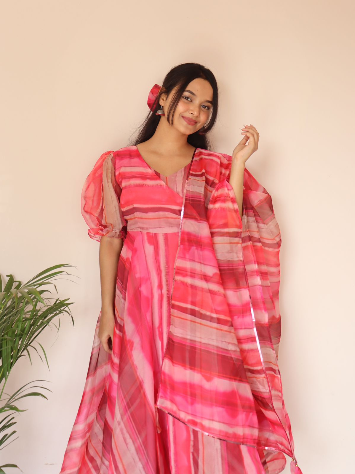 Gown: Organza Silk, Digital Print, Fully Stitched, Huge Flair, Sizes XS–XL