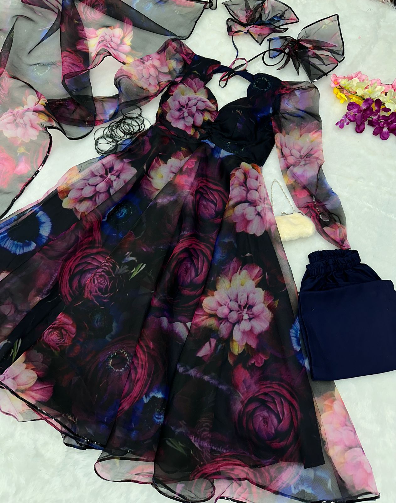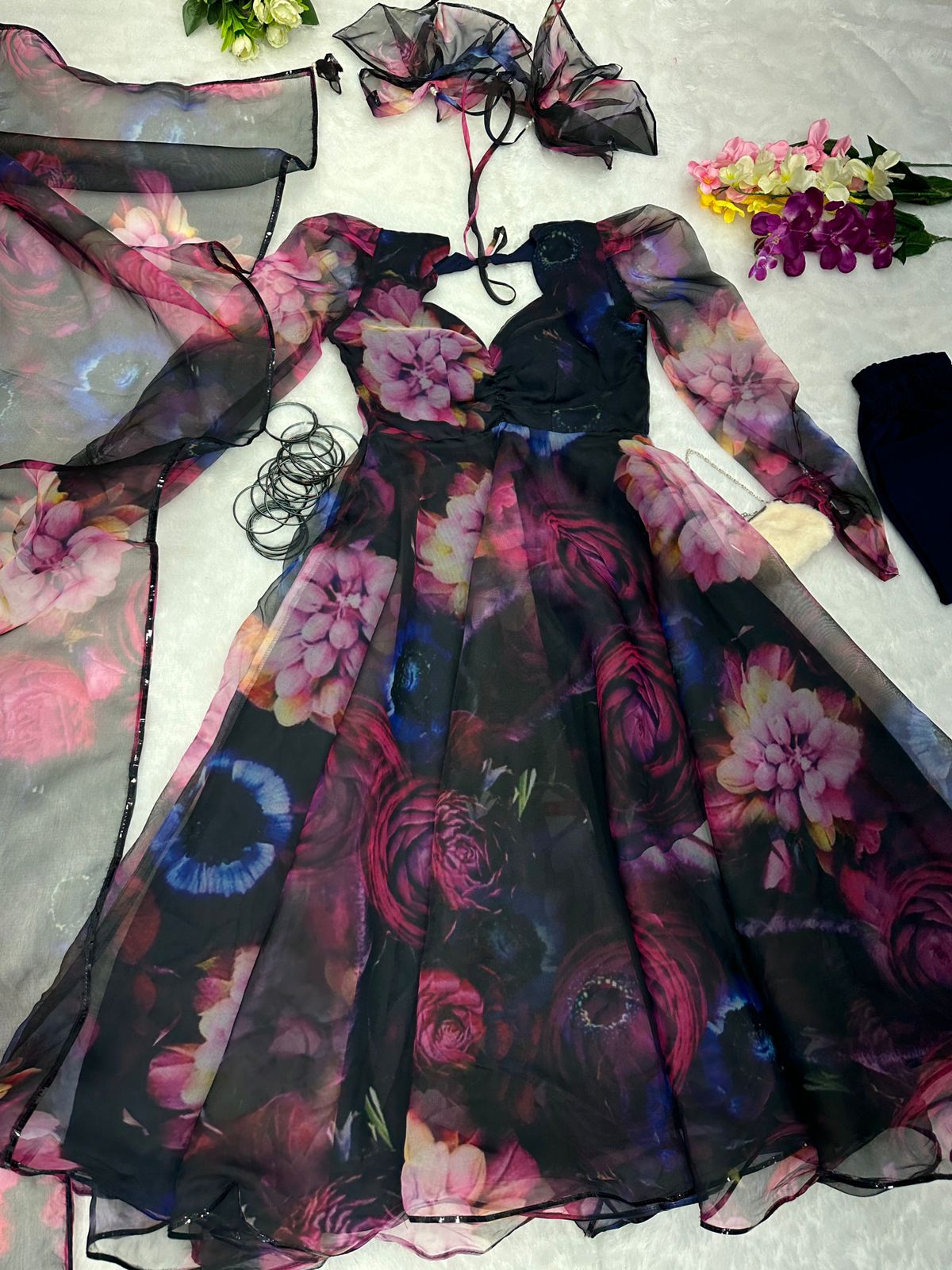 Step into graceful sophistication with our Organza Silk Digital Printed Anarkali Suit Set, a harmonious blend of traditional charm and contemporary elegance.