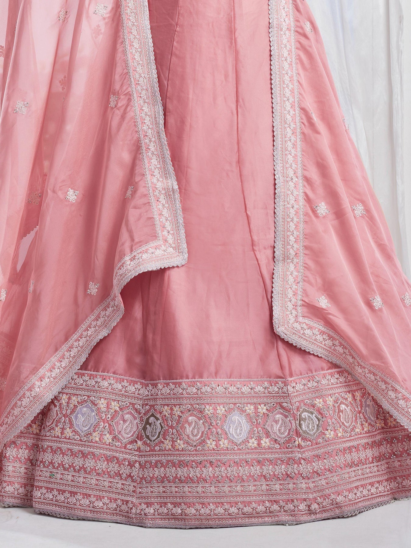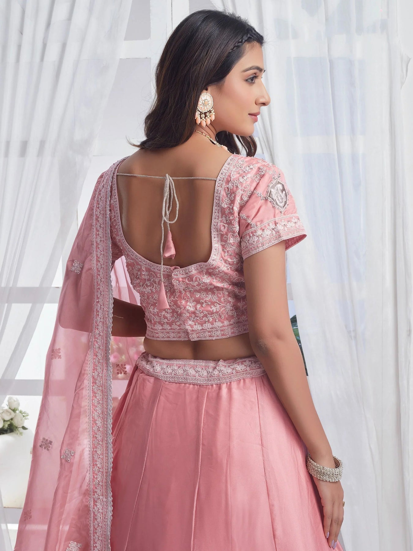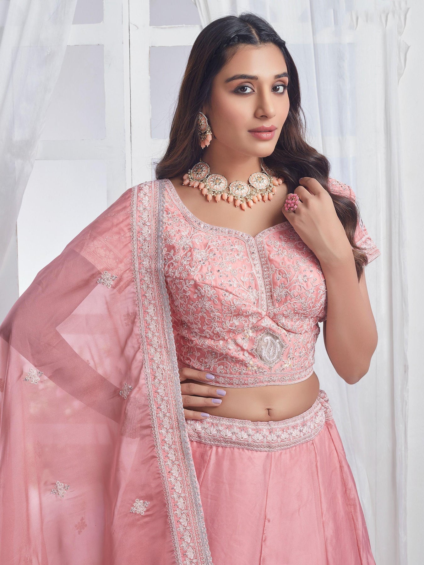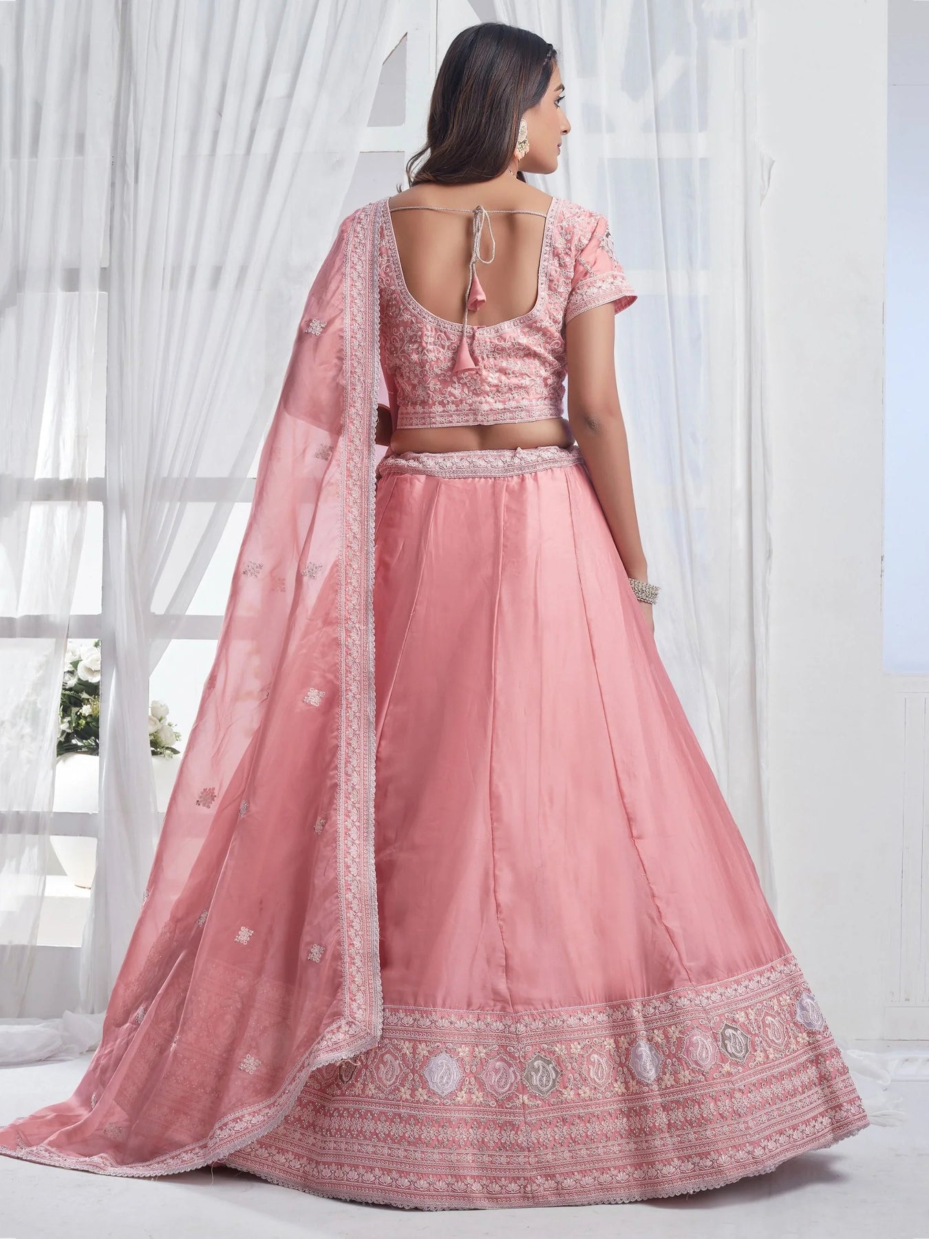 Introducing the stunning adorable peach embroidered organza wedding lehenga choli, crafted to make you shine at any special occasion. This elegant ensemble combines traditional charm with contemporary detailing, creating a timeless festive look.