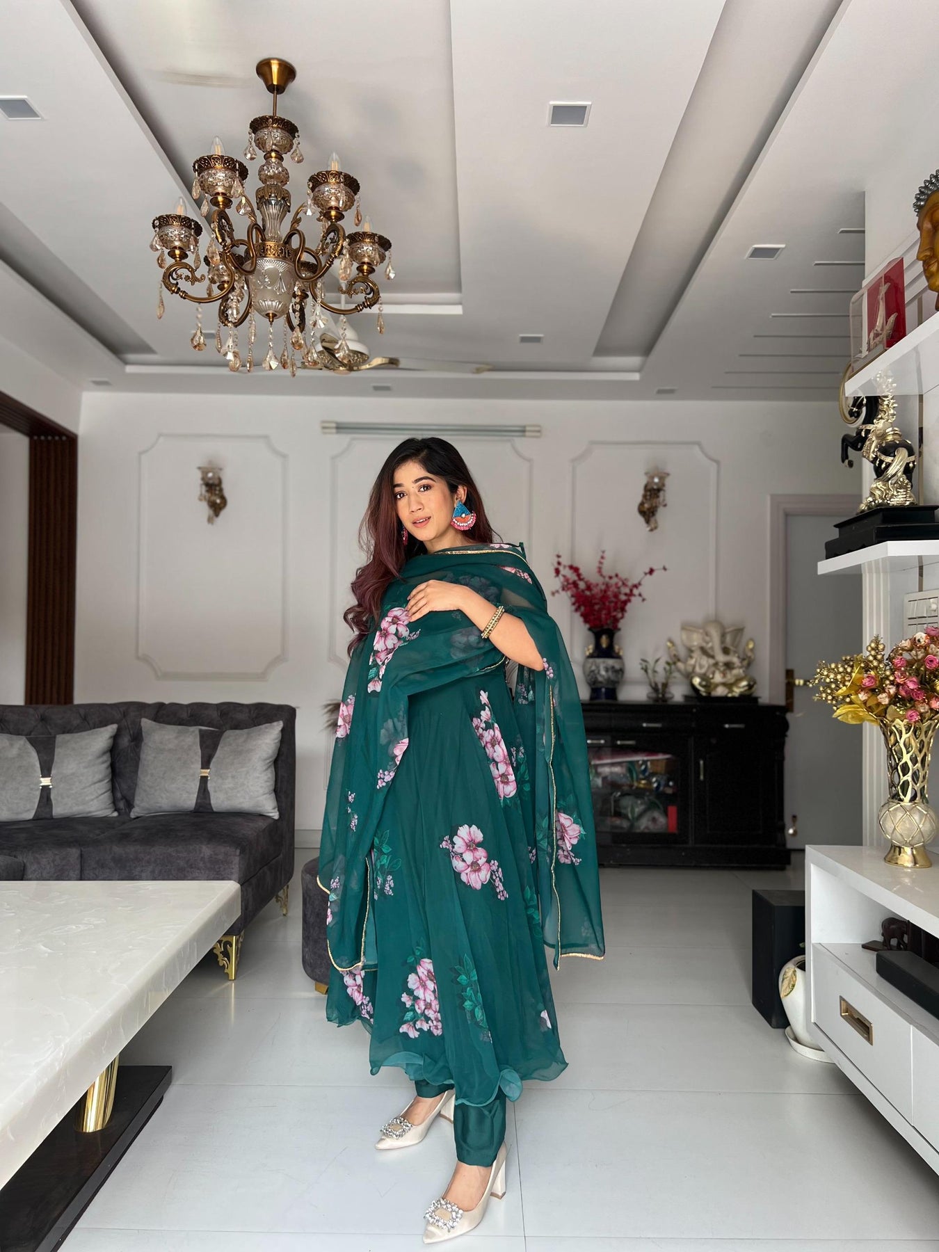 This fully stitched set includes a flowy Anarkali gown, a comfortable butter cotton pant, and a matching pure georgette dupatta with lace detailing. Designed for effortless style and timeless grace.