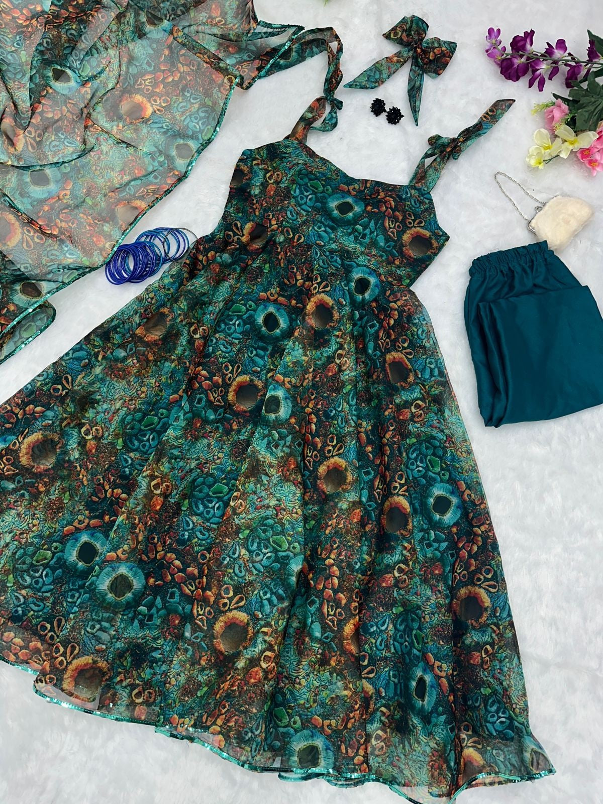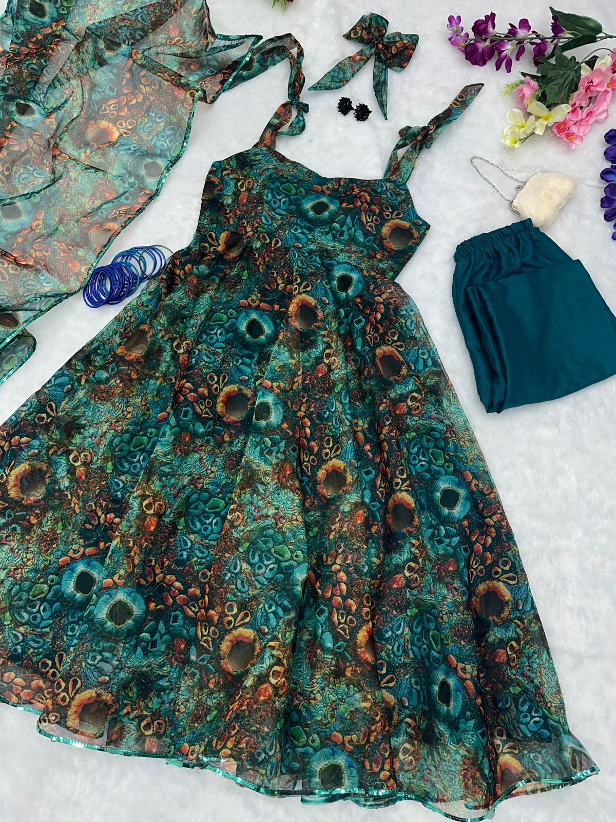 Turn heads at every occasion with our Pure Organza Silk Anarkali Suit, designed with a grand flair and delicate lace border. The rich digital prints on the flowing fabric add a touch of modern charm, while the timeless Anarkali silhouette ensures effortless grace.