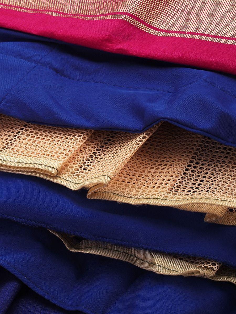 The royal blue tussar silk lehenga features a 3.40-meter flair, stitched with canvas and attached can-can for voluminous grace and a regal look. An inner layer of micro cotton ensures comfort, so you can celebrate and dance all night with ease.