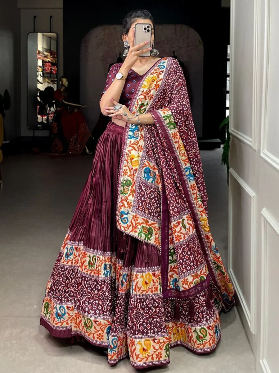 Add a touch of tradition and sartorial elegance to your festive celebrations with this Rich Maroon Patola Print Lehenga Choli, crafted in luxurious crushed dola silk. Designed to make you feel like royalty, this ensemble blends timeless charm with a modern flair.