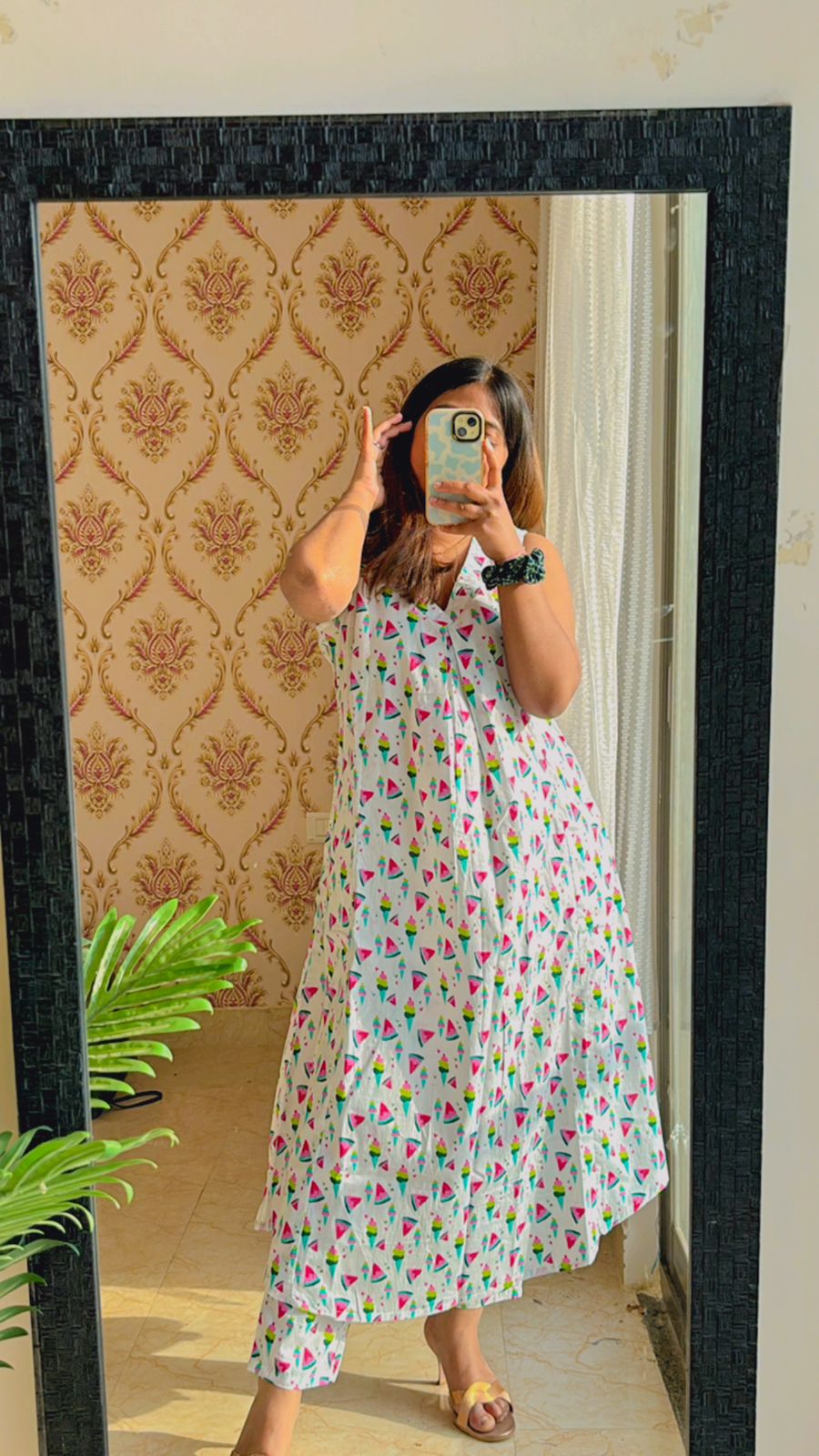 Introducing our delightful White Summer Treats Cotton Kurta Pants Set, where sweetness meets style! The kurta features a fresh white base adorned with charming small ice cream and watermelon prints, adding a playful and refreshing touch to your ensemble. Its sleeveless design and elegant V-neckline exude modern sophistication, while the A-line pattern ensures a flattering silhouette that drapes effortlessly.