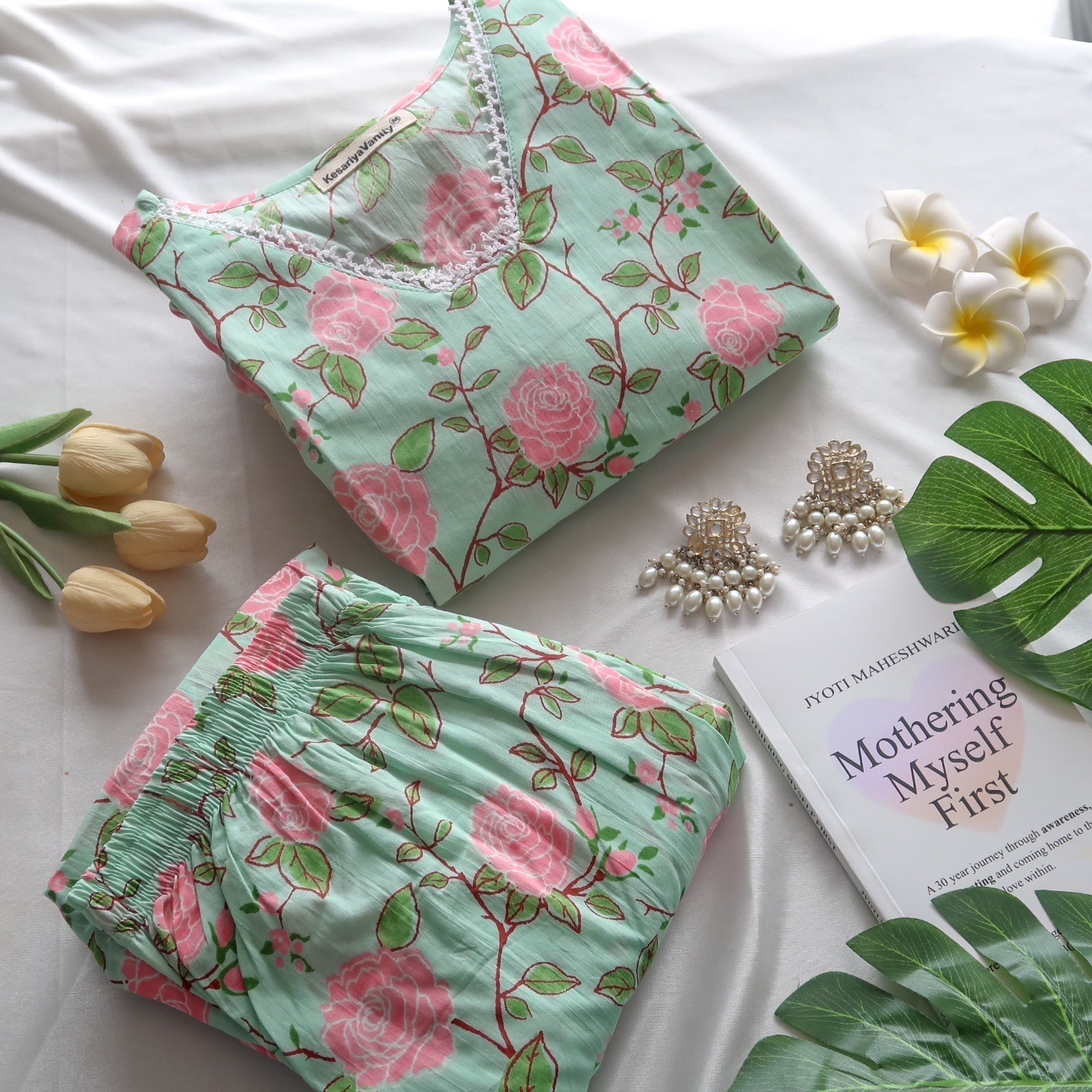 Sukoon sets Crafted from premium cotton fabric, this kurta pants set exudes timeless charm and refined style with its exquisite design and intricate lace detailing.
