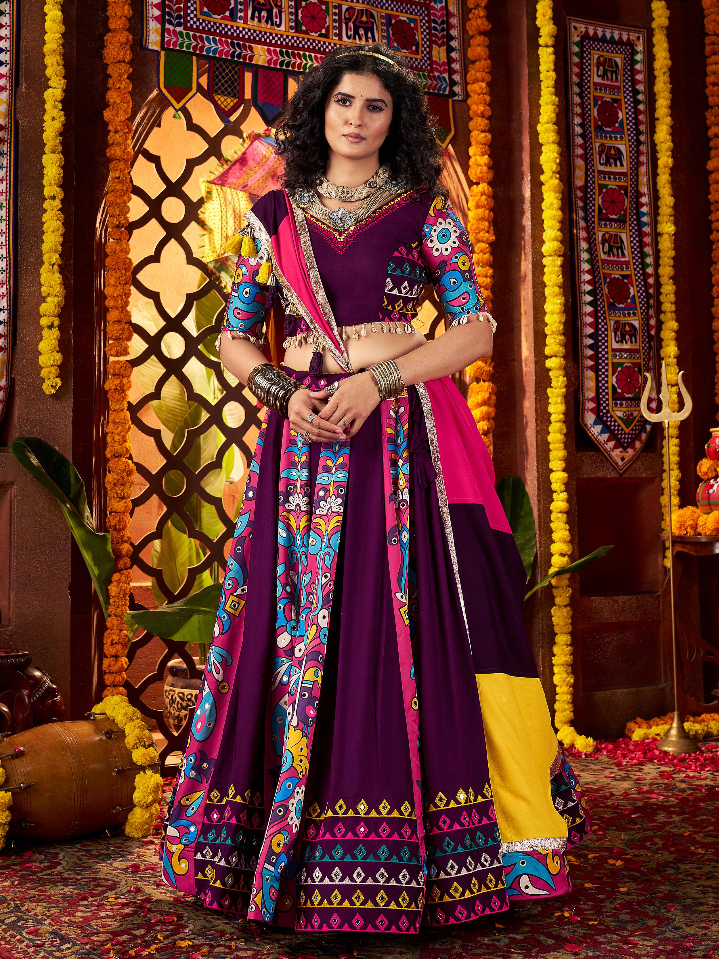 Step into festive elegance with this viscose cotton lehenga choli, designed with a captivating mix of vibrant colors and intricate digital prints. The ensemble is enhanced with multi-thread embroidery and shimmering mirror work, giving it a festive sparkle that’s perfect for Navratri, weddings, and grand celebrations.