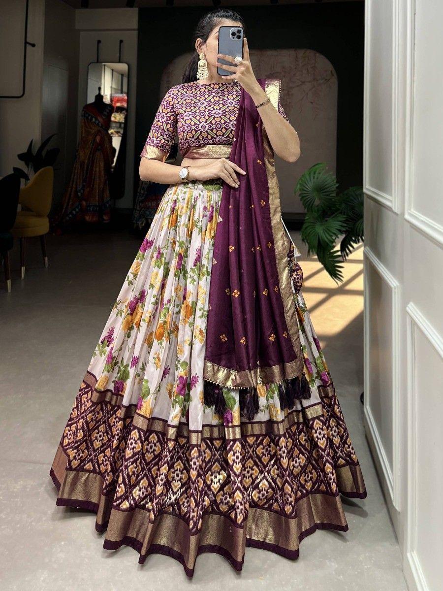 Introducing the Pretty White & Wine Floral Printed Tussar Silk Festival Wear Lehenga Choli, a perfect blend of tradition and elegance.